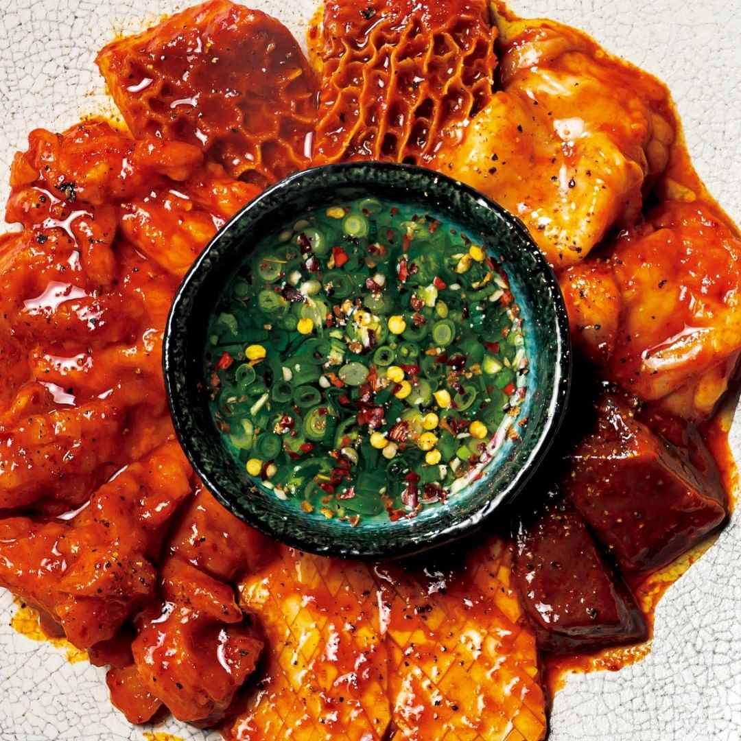 小腸、ミノ、ハチノス、レバーなど、食感も風味も異なる内臓肉の盛り合わせ。