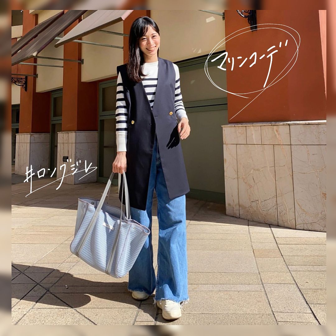 大人可愛い紺色のロングジレで、魅力増しに✨着るだけで、きちんと感も出て、とっても素敵ですね🥰ボーダーのトップスと合わせた、マリンテイストが、爽やかで良い感じです👌