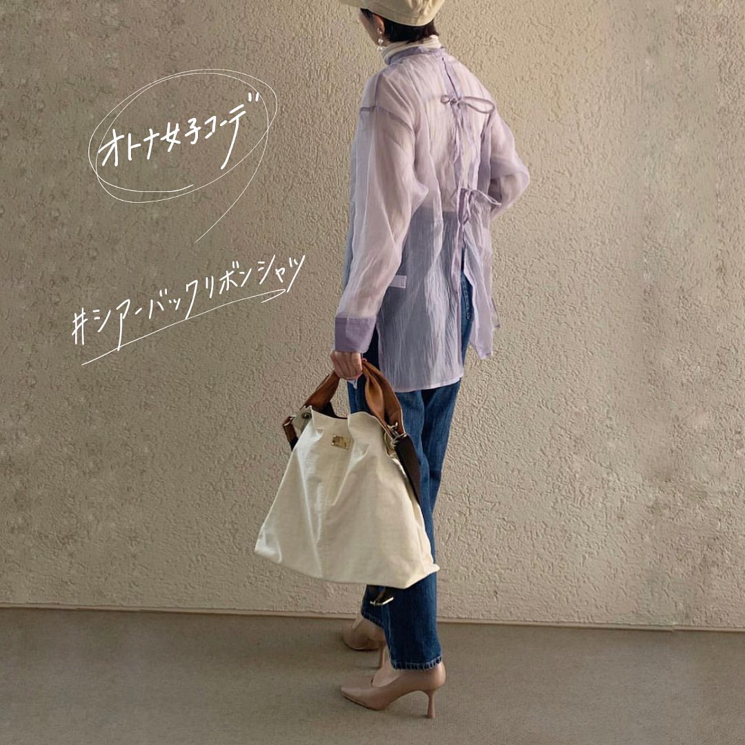 人気のシアーシャツのNEWデザイン✨淡いパープルで着こなしたスタイリングが、オトナ可愛い😘程よい透け感を味方にした、ジーンズコーデが最高です👏フロントはバンドカラーで、スッキリしたデザインなので、挑戦しやすいです👌シアーバックリボンシャツ🙌是非、チェックしてみてくださいね💁♀️💕