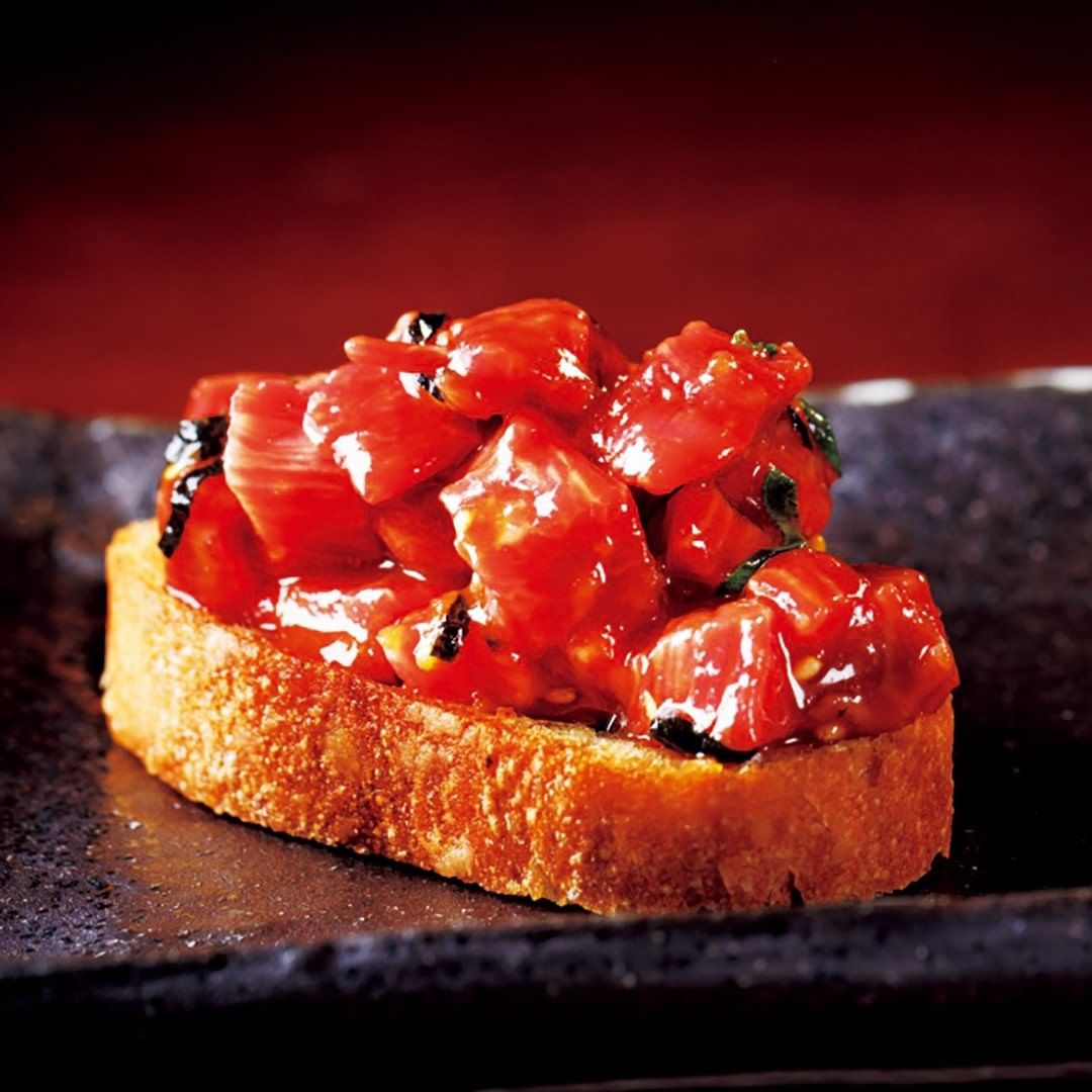 さまざまな部位の生肉を粗めの角切りにし、バゲットに溢れるほどのせている