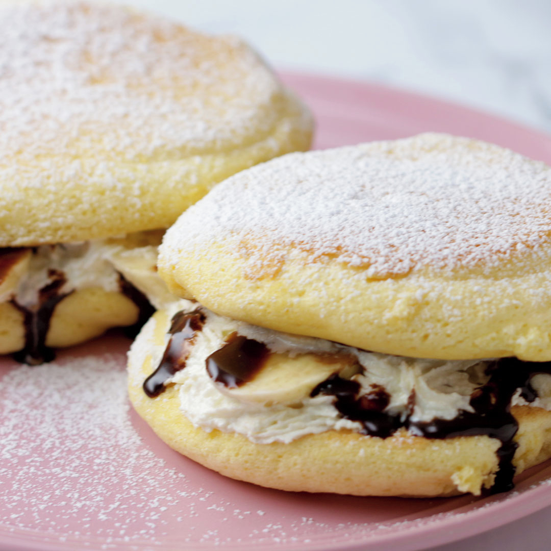 7.パンケーキを2枚1組にし、ホイップクリームを絞り、いちごやバナナ、チョコソースをかけて挾む。仕上げに粉砂糖を振ったら、完成!