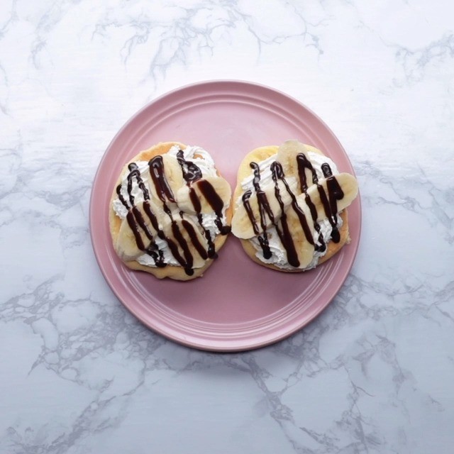 7. Place a pancake on a plate, squeeze whipped cream, top with slices of banana and chocolate sauce, place another pancake on top to finish the burger. Finish with powder sugar on top.