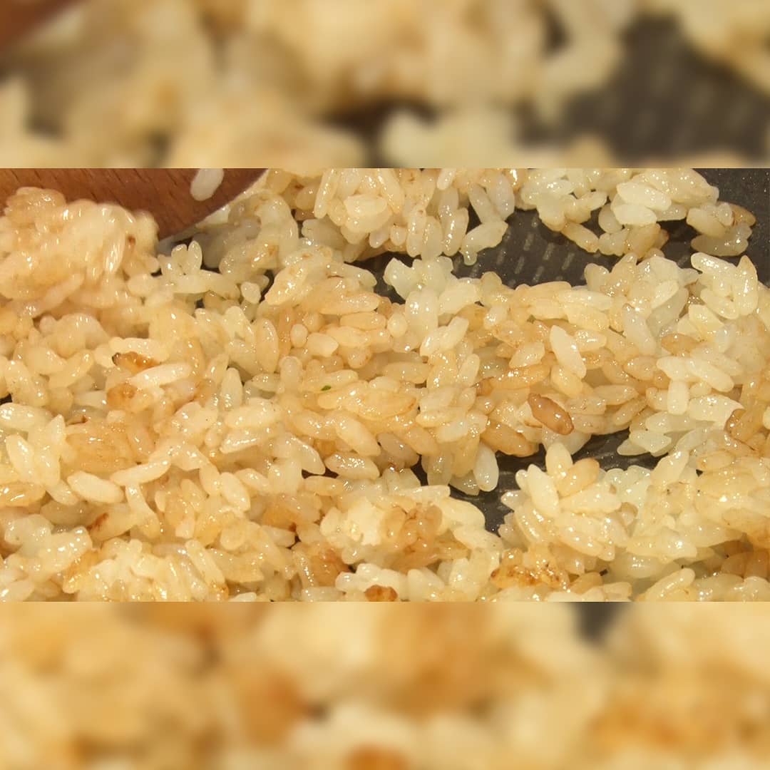 ⑥バターライスをフライパンの端に寄せ、空いたスペースにしょう油大さじ1/2を入れ、焦がししょう油を作り、ご飯と混ぜ皿に移す
