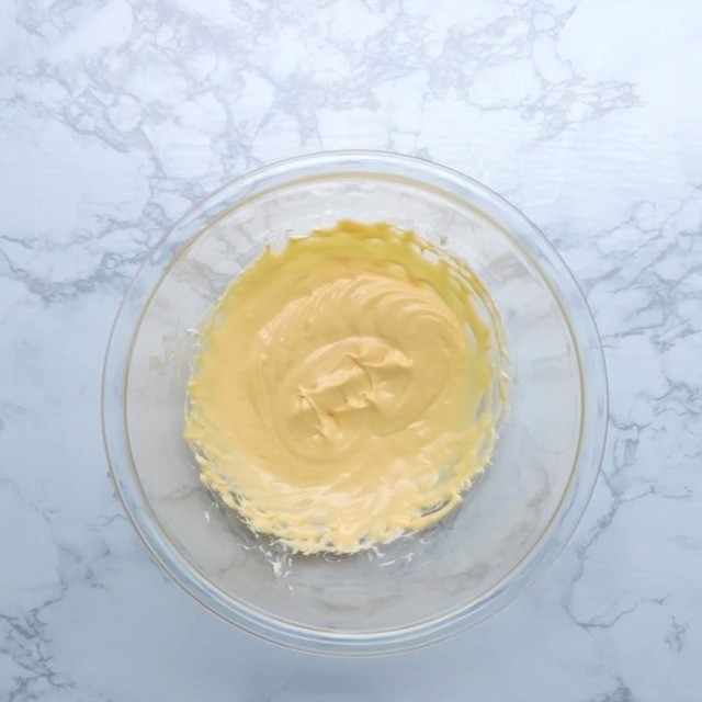 2. 別のボウルにクリームチーズと残りの砂糖を入れ、ハンドミキサーで混ぜる。なめらかになったら卵黄、生クリーム、レモン汁を加え、よく混ぜる。