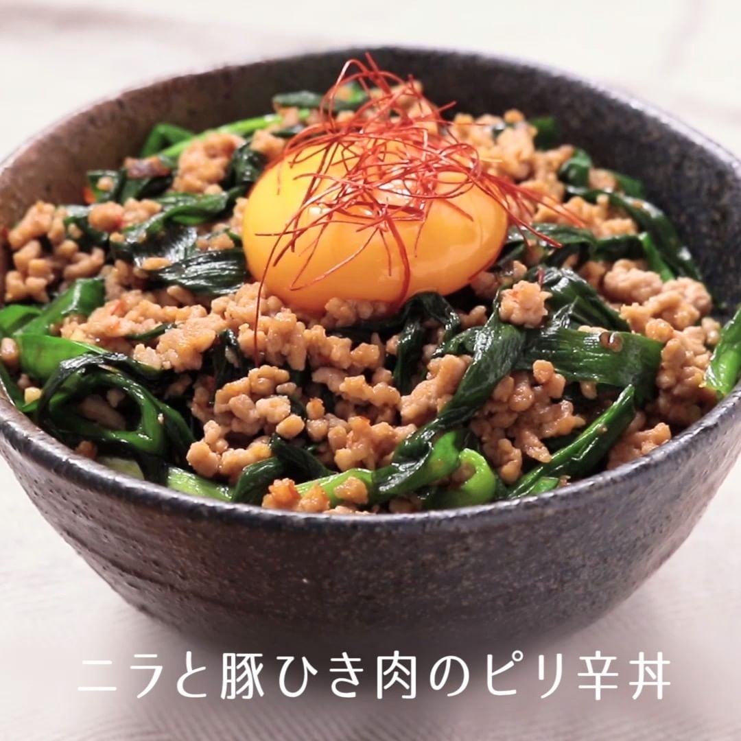 ②ニラと豚ひき肉のピリ辛丼