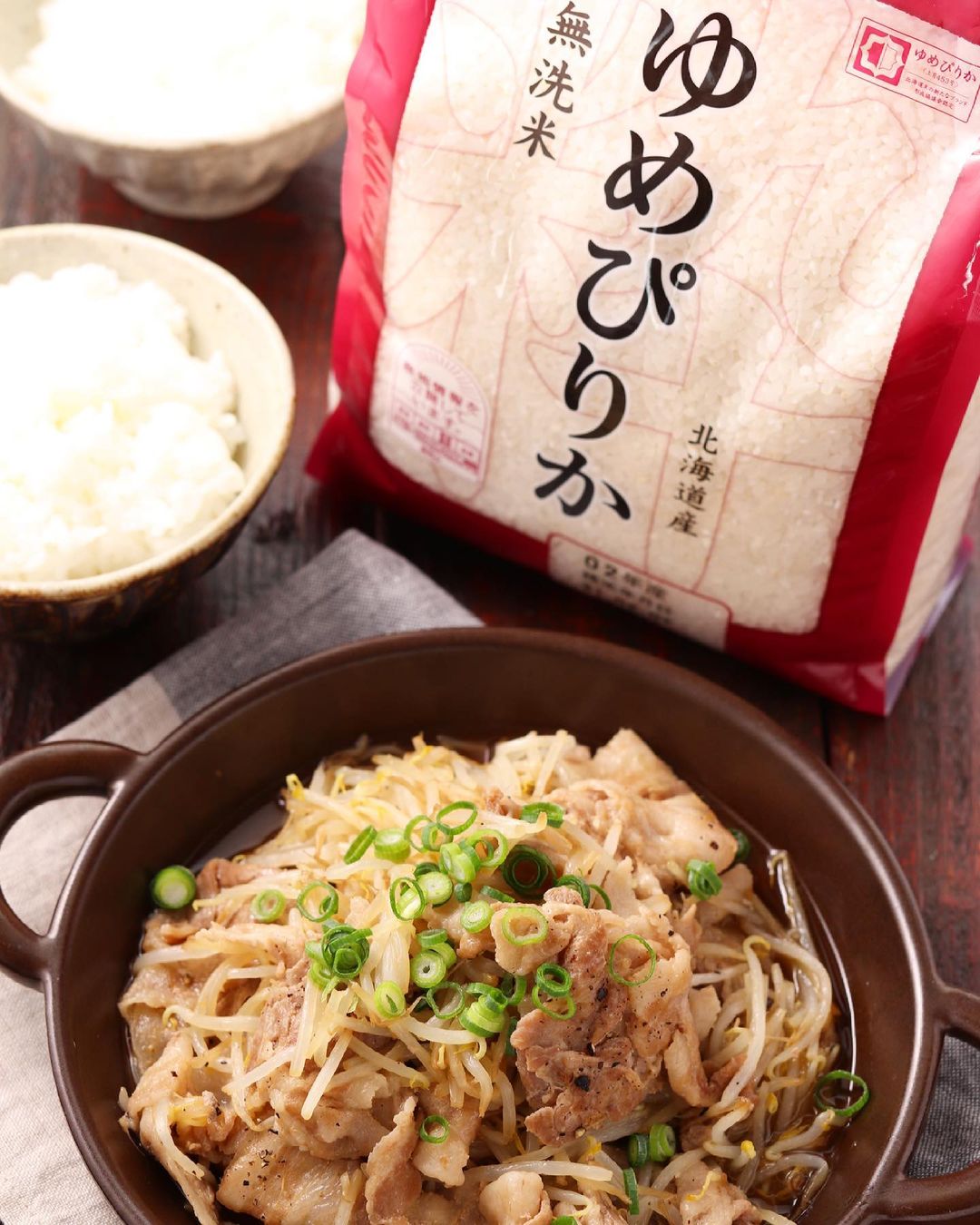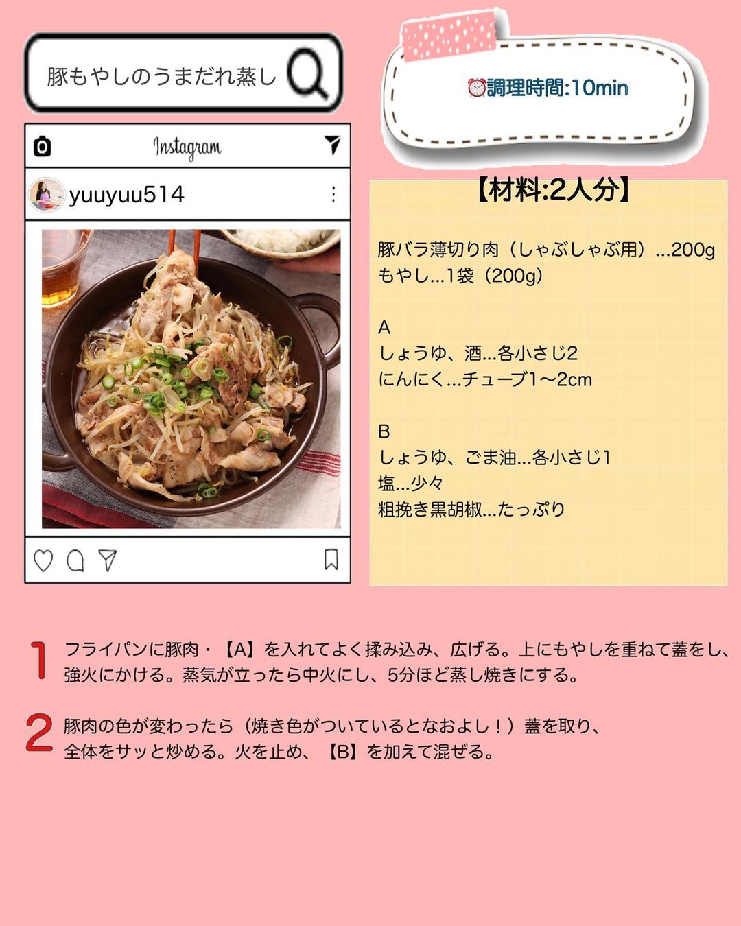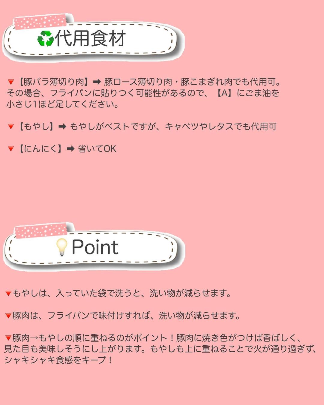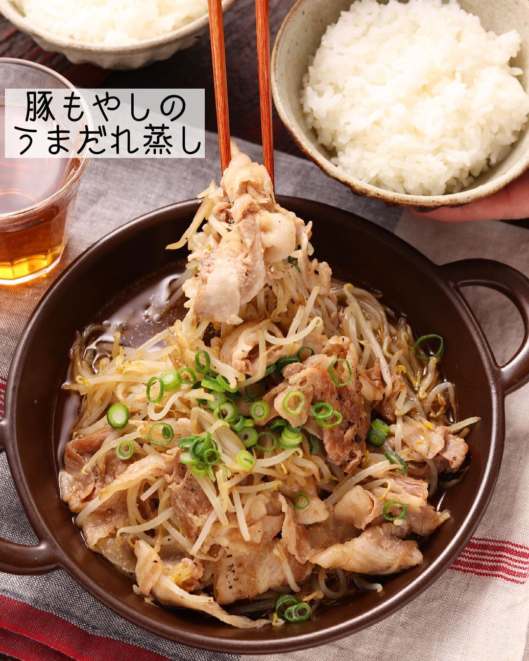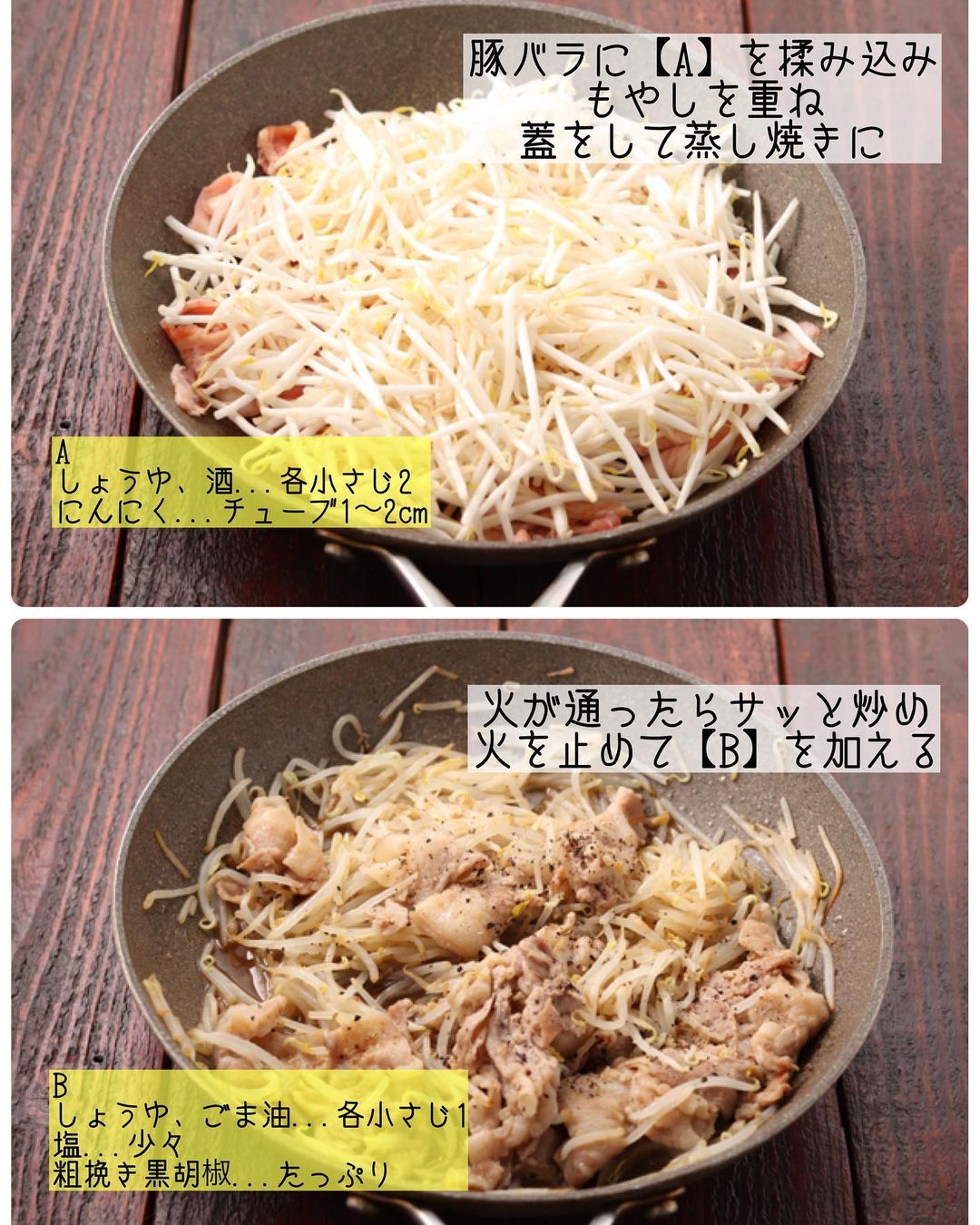 ➊フライパンに豚肉・【A】を入れてよく揉み込み、広げる。上にもやしを重ねて蓋をし、強火にかける。蒸気が立ったら中火にし、5分ほど蒸し焼きにする。