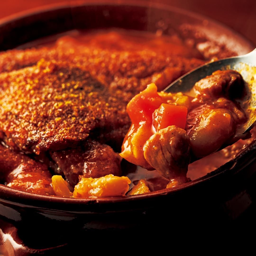 ブイヨンで白インゲン豆、豚のソーセージ、子羊、鴨のコンフィを煮込む