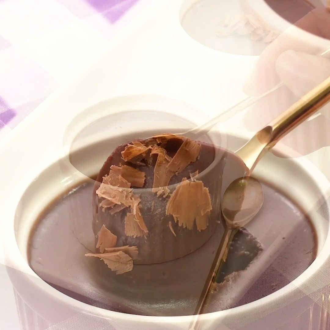 (2)チョコレートを割り入れて、混ぜて溶かし、カップに等分に流し入れて冷蔵庫で1時間以上冷やし固める。