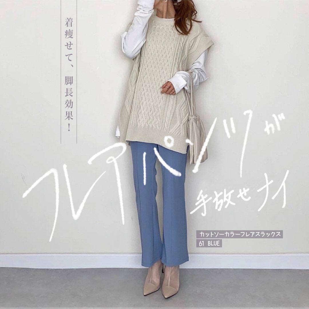 1度はいたら、手放せない✨フレアパンツ😘絶妙なきれいシルエットで、スタイルUP👌とっても良い感じです🥰カットソー素材だから、動きやすくて👍ペールトーンのカラバリも、抜群に可愛いです👏日常使いに最適なスラックス🙌