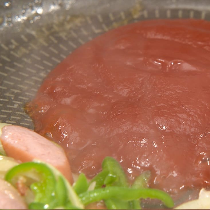 ②フツフツしてきたら薄切り玉ねぎ1/2玉、細切りピーマン1個、食べやすいサイズのウインナー2本を入れる
