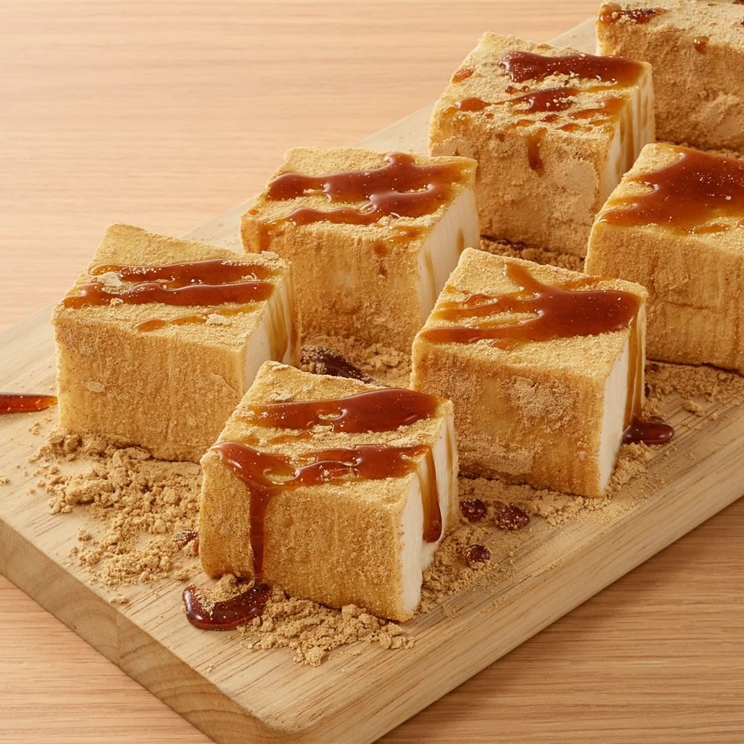やさしい甘さともっちり食感が特長のミルクくずもちに、きなことコクのある黒みつをかけました。