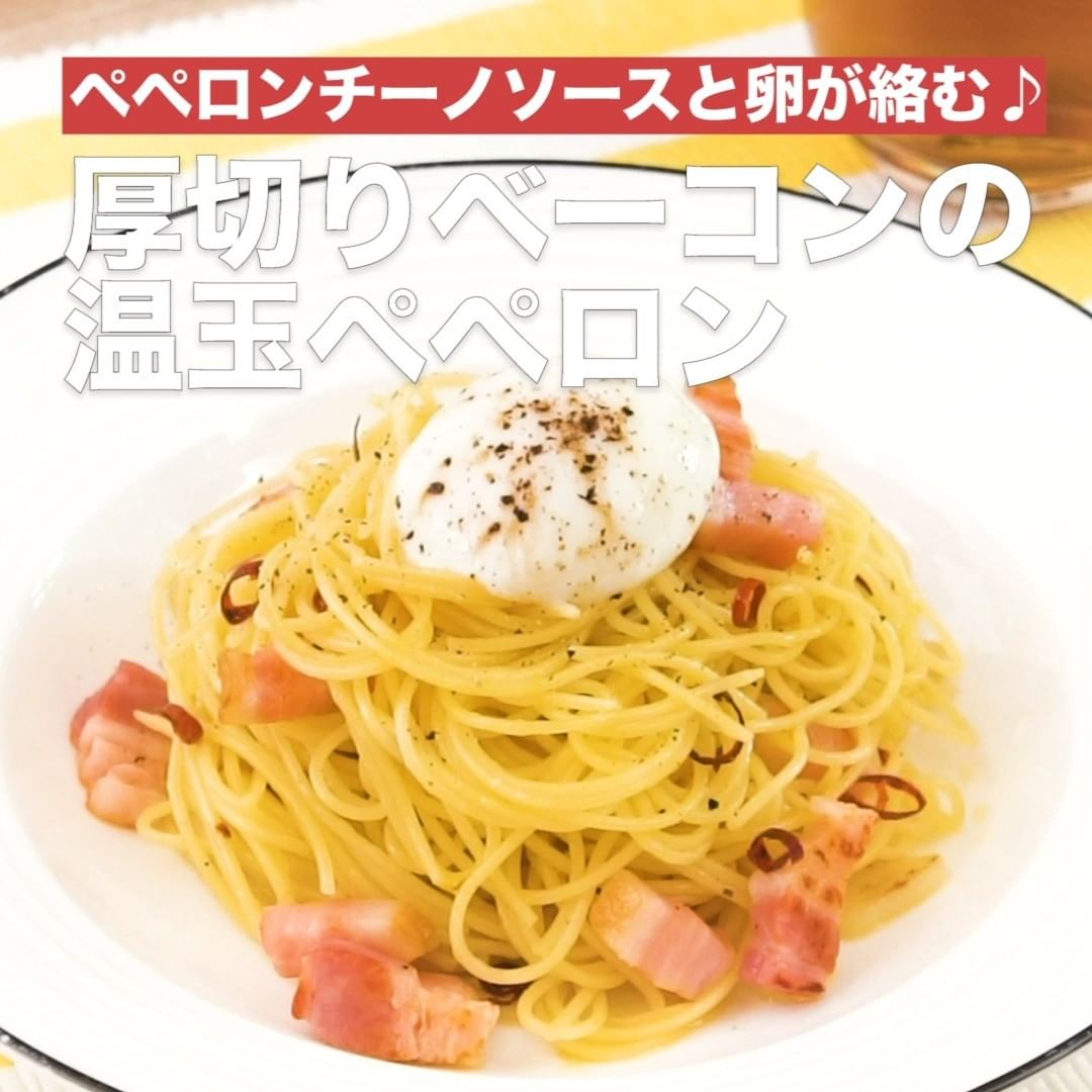 ⑧<ペペロンチーノソースと卵が絡む♪厚切りベーコンの温玉ペペロン>