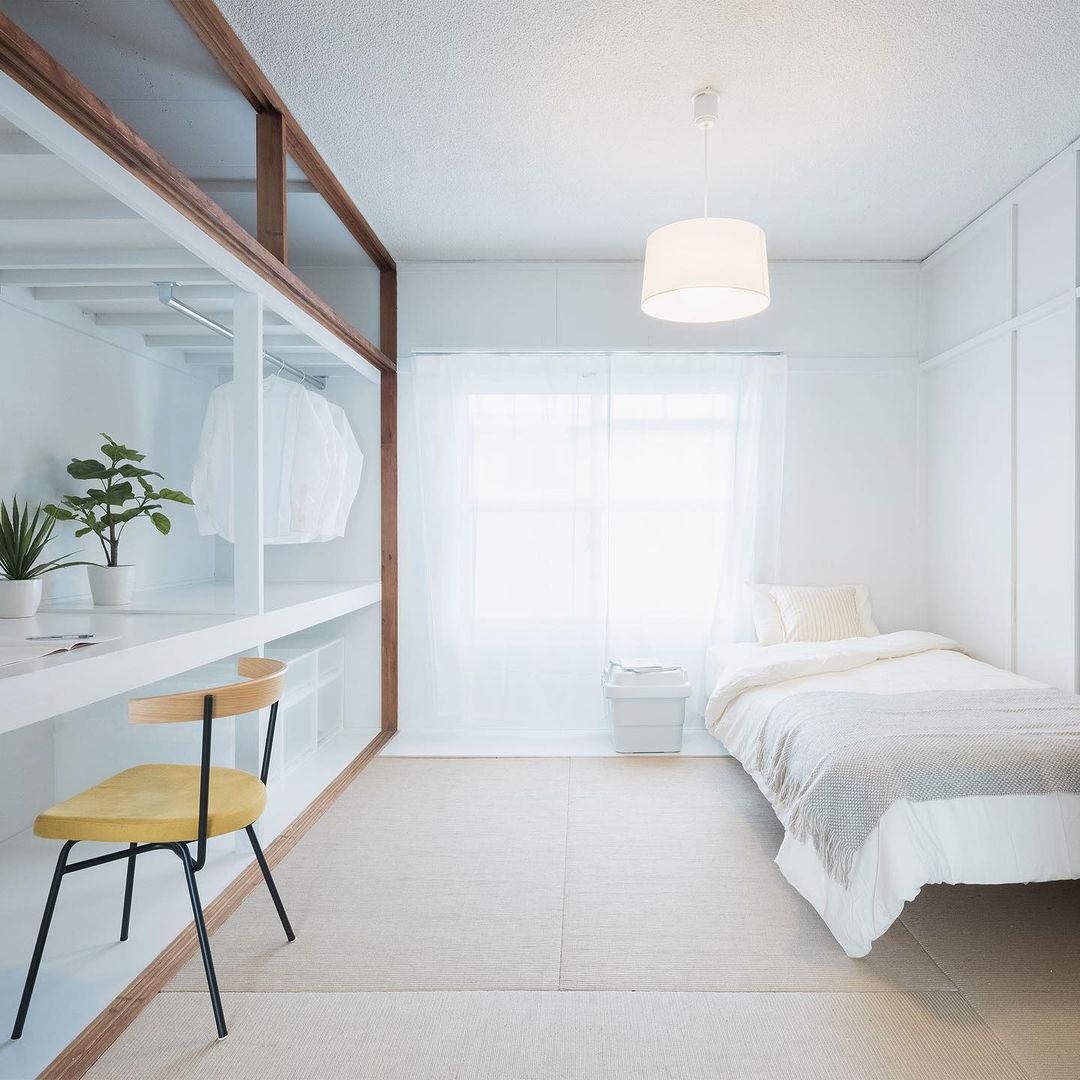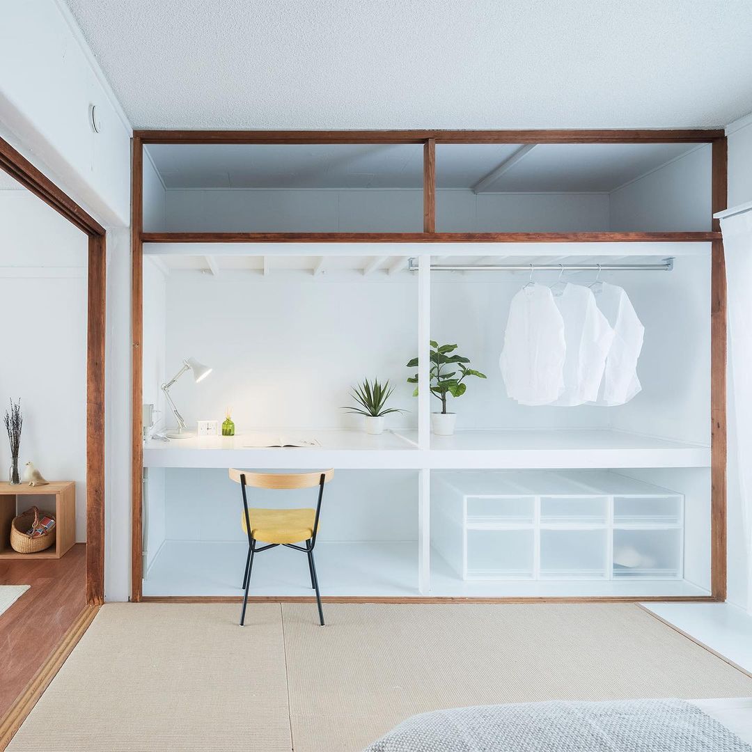 コンパクトな空間の中で、押入を最大限に有効活用できるように、中棚をそのままワークデスクとして仕上げハンガーパイプを設置し、ワードローブとしても利用できるようなフレキシブルな押入を設置しました。