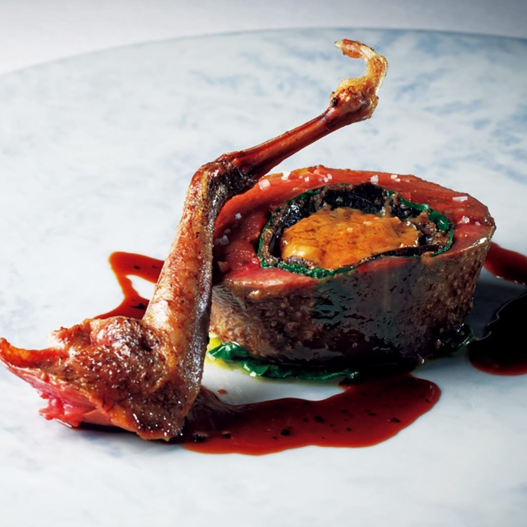 写真②▷「ラカン産仔鳩のロースト」は、トリュフ入りの古典的ソースを添えた2周目のメイン。