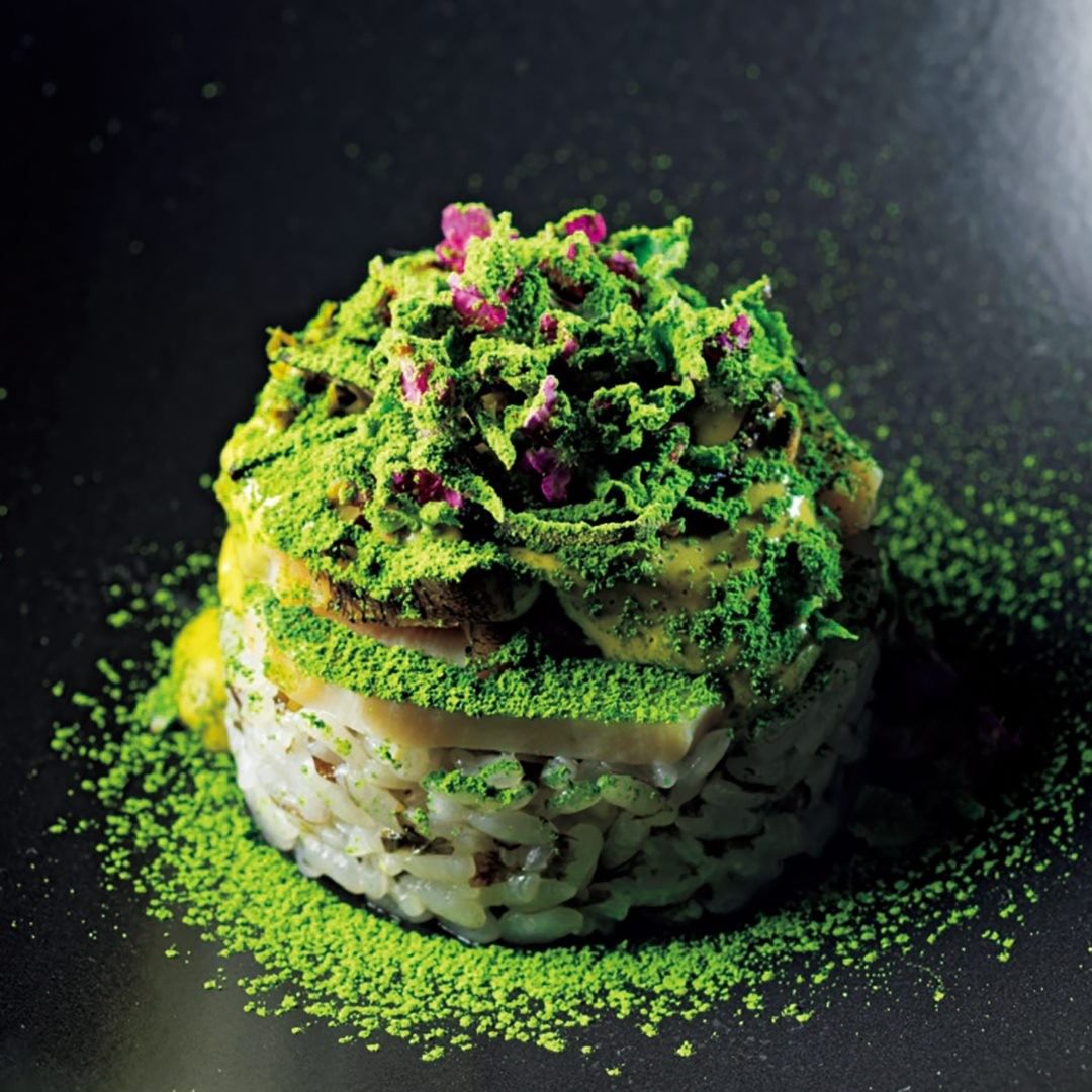 写真⑤▷前菜的な位置付けで供される「小田原産黒鮑の抹茶リゾット」が2周目の始まりの合図