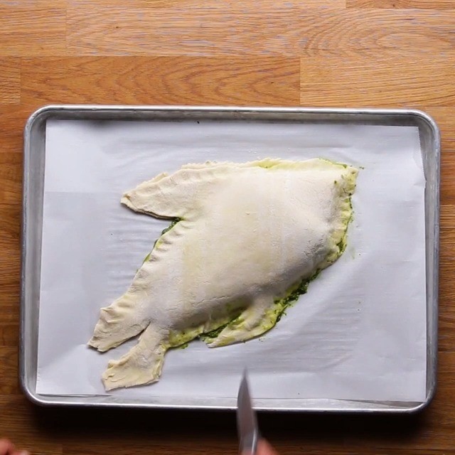 5. 2枚目のパイ生地をのせ、シャケの周りの生地を押して形を整える。魚の形に輪郭を切り取る。パイ生地の切れ端は取りのぞいて置いておく。