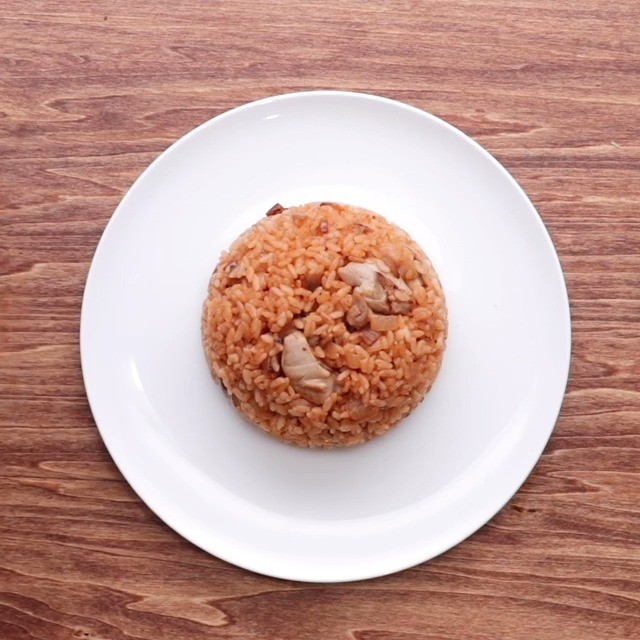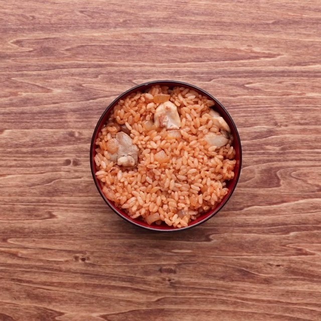 2.肉に火が通ったら、ごはんを加えて木べらでほぐしながら炒め、ケチャップを加えて全体に馴染むまで混ぜる。火からおろし、皿の上に盛っておく。