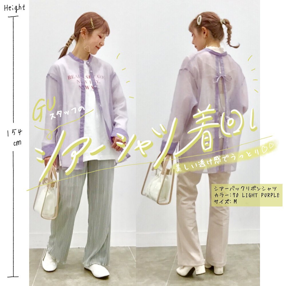 GUスタッフおすすめの😘シアーシャツの着回しです👍旬のレイヤードスタイルを、アップデートしてくれる✨シアーシャツ❣️今年は、デザイン性やカラバリなど😄益々、可愛く着こなせるアイテムが登場しています👍気持ち軽やかに、コーデを楽しみたいですね😍