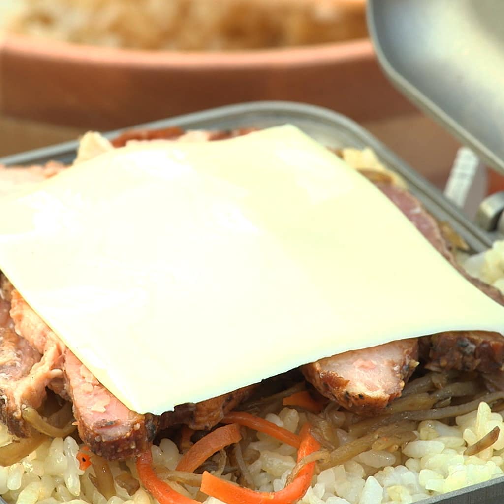 ④お好みでスライスチーズ1枚をのせ、残りのご飯を山型にのせ閉じる