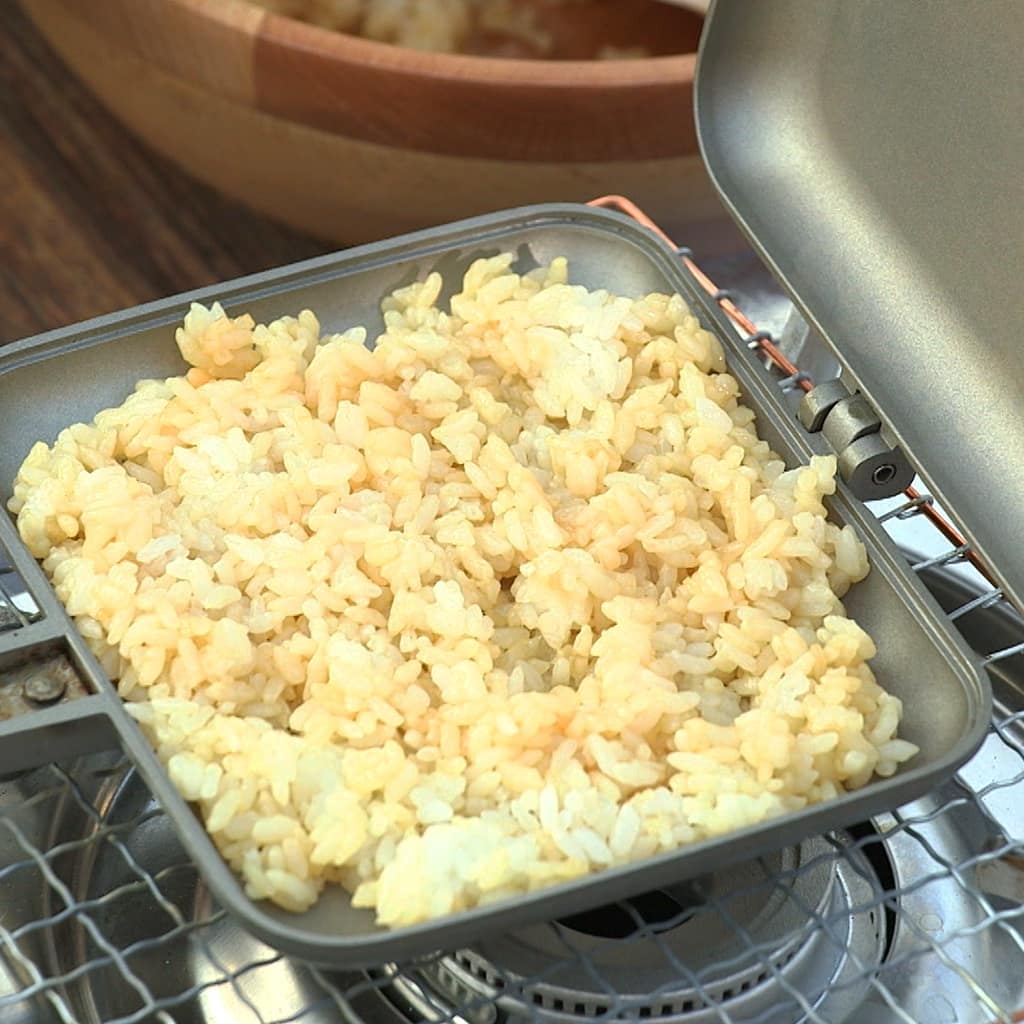 ②ホットサンドメーカーにご飯半分を平らに敷き詰める