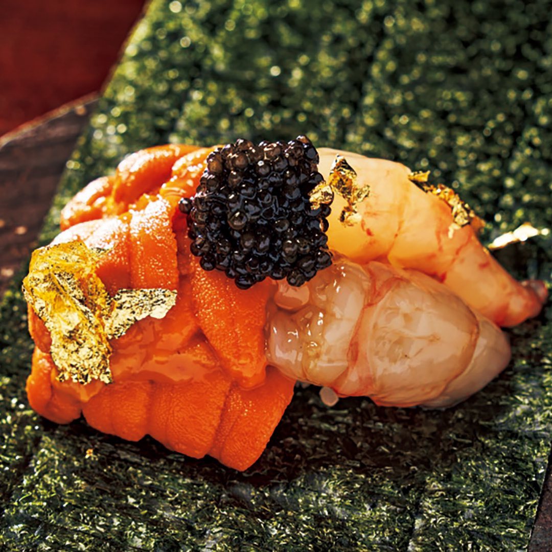 写真①▷「生ウニと牡丹海老の飯蒸し」には、イタリア産のキャビアものる。
