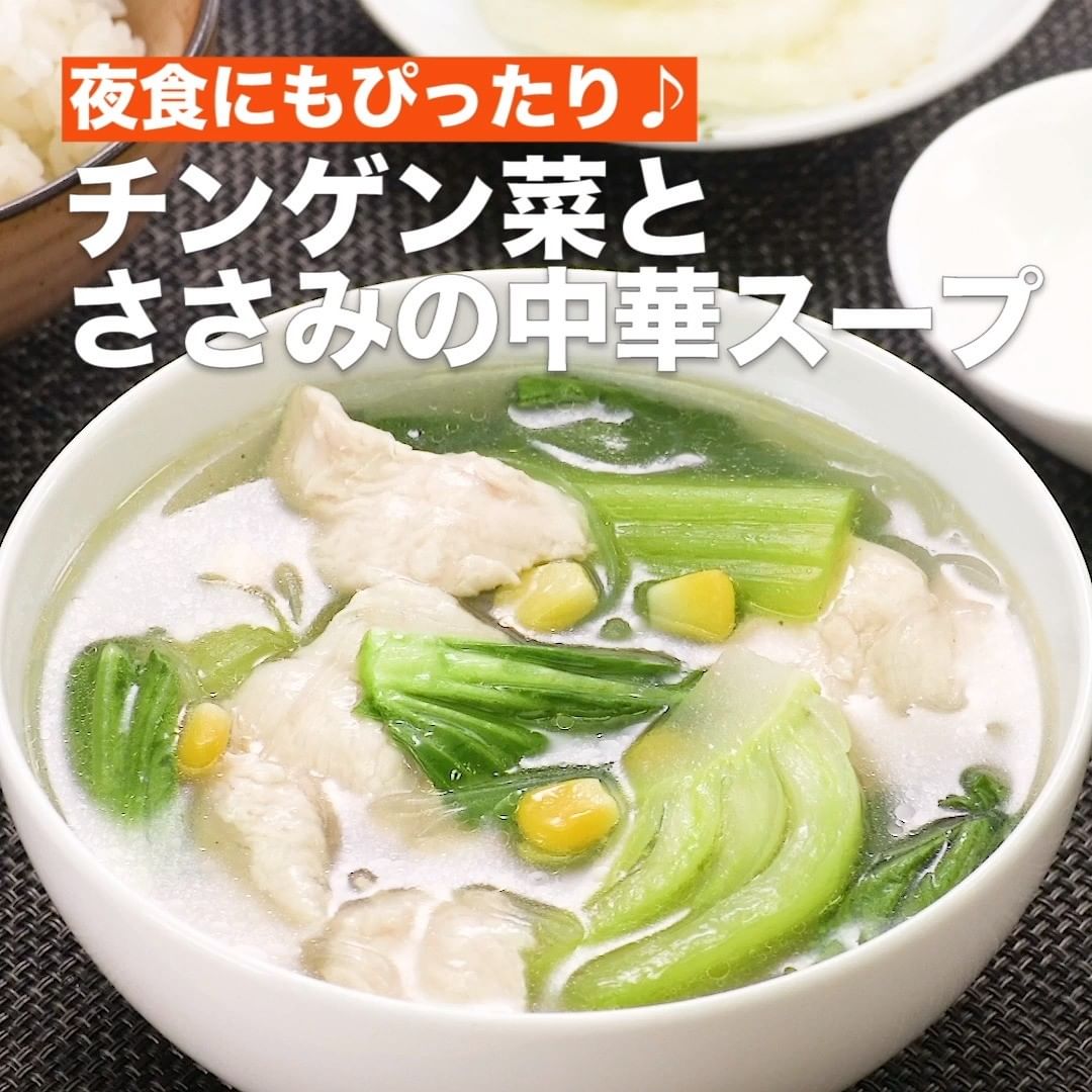 ⑦<夜食にもぴったり♪チンゲン菜とささみの中華スープ>
