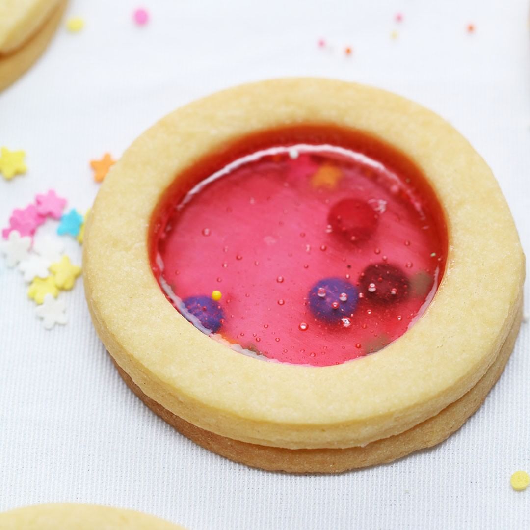 4.クッキングシートを敷いた天板に(3)を並べて、180℃のオーブンで10分焼く。焼き上がったら、クッキーの空洞部分にキャンディーを置き、180℃のオーブンで3~5分、キャンディーが溶けるまで焼く。キャンディーが溶けたらオーブンから取り出し、キャンディーが固まるまで室温で冷ます。