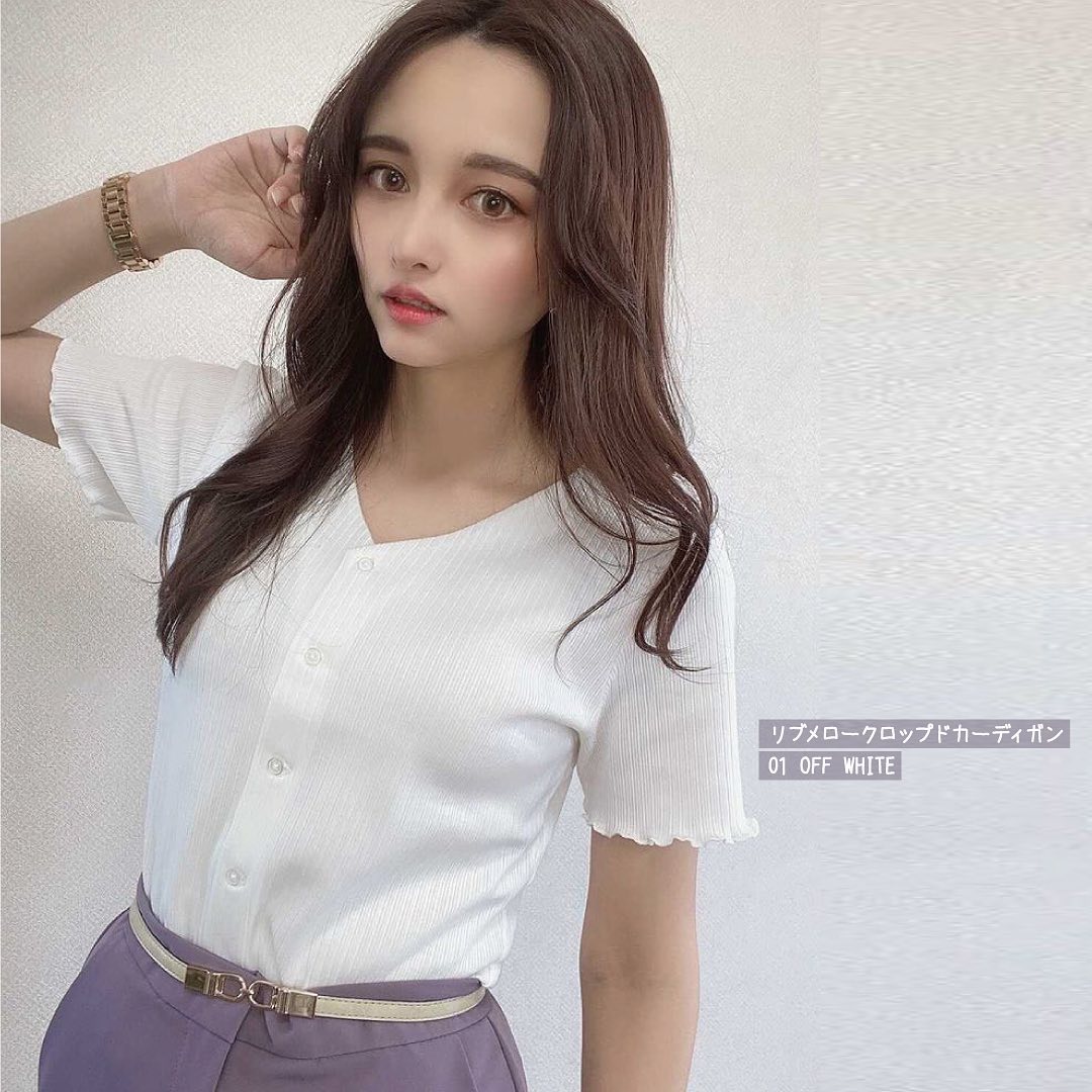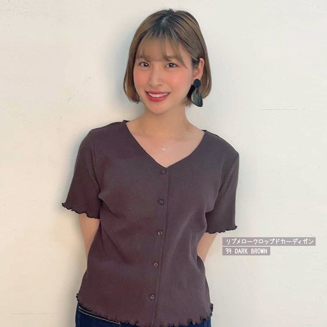 コンパクトなシルエットが、可愛くて👌さりげないリブメローな袖や裾で、もっと可愛くて🥰シンプルなボトムスに、合わせるだけでGOOD👍とっても素敵に着こなせますね👏ボタンを閉めると、程よいVラインのトップスとして😘