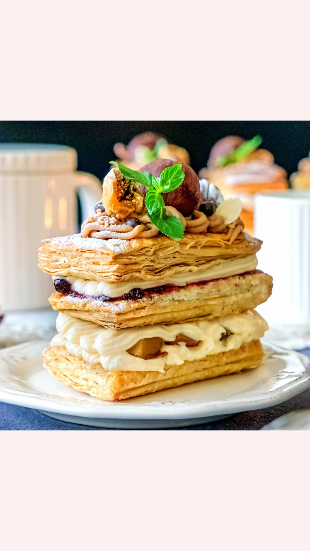 7. (6)の上にパイ生地をのせ、マロンクリームを絞る。栗の渋皮煮、アーモンドスライス、パールチョコ、アーモンドプラリネ、ドライイチジク、ピーカンナッツ、ミントをのせ、粉糖をかける。