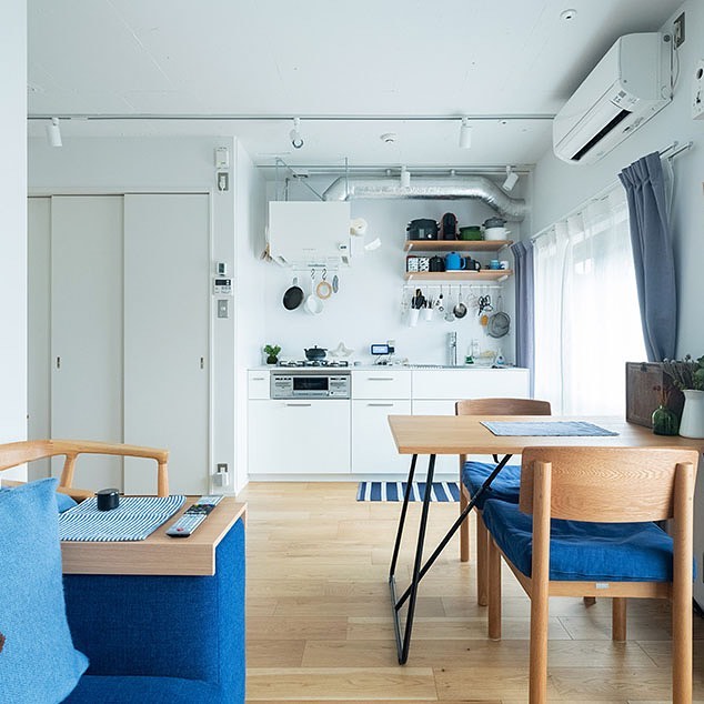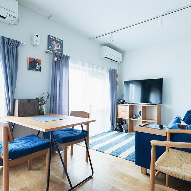 白を基調に、アクセントとして青いインテリアを配した、清潔感のある室内が印象的です。