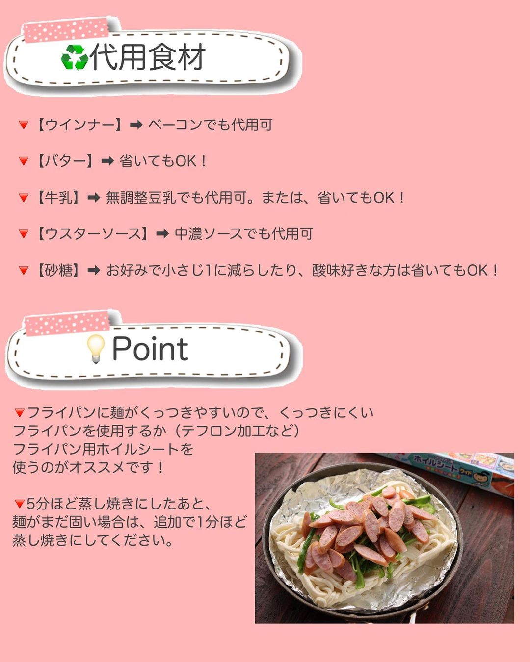 ➋フライパンに冷凍うどんを重ならないように並べ、玉ねぎ→ピーマン→ウインナーの順に重ねる。塩・こしょうをふり(野菜にかける感じで!)、水大さじ3(分量外)を回し入れる。蓋をして強火にかけ、ジューっという音と湯気がたったら中火にし、5分ほど蒸し焼きにする。