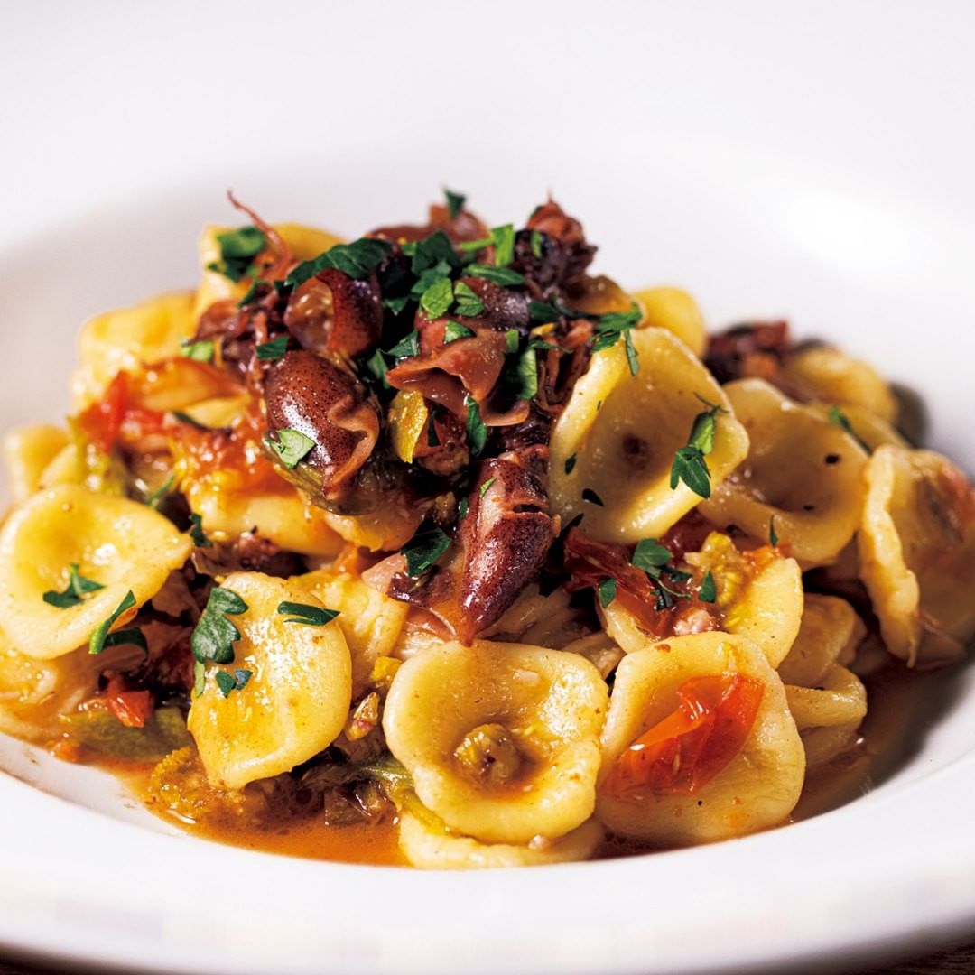 写真①▷春を表す「ホタルイカと蕗の薹のオレキエッテ」。