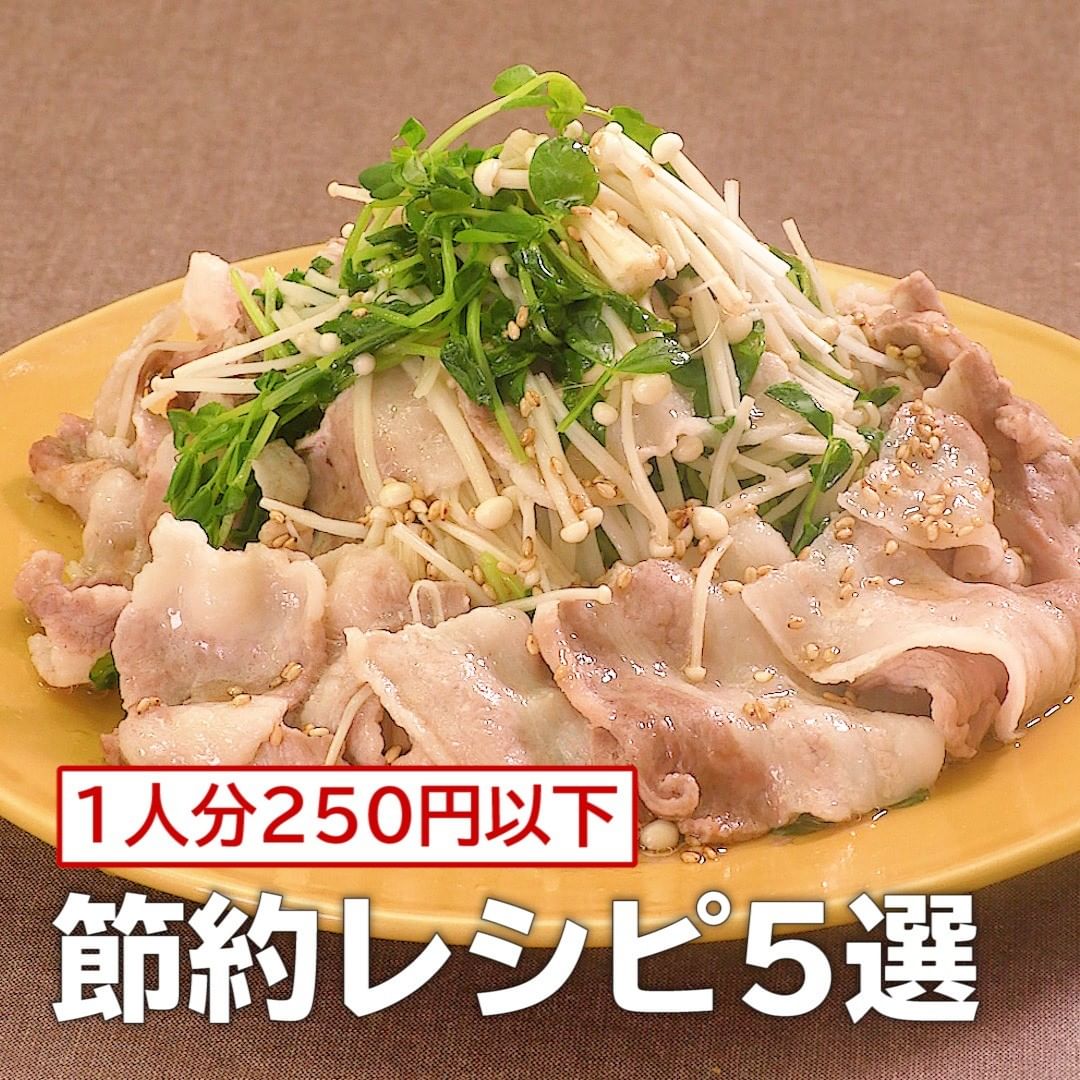 ①<レンジで5分!豚バラえのきと豆苗のレンジ蒸し>