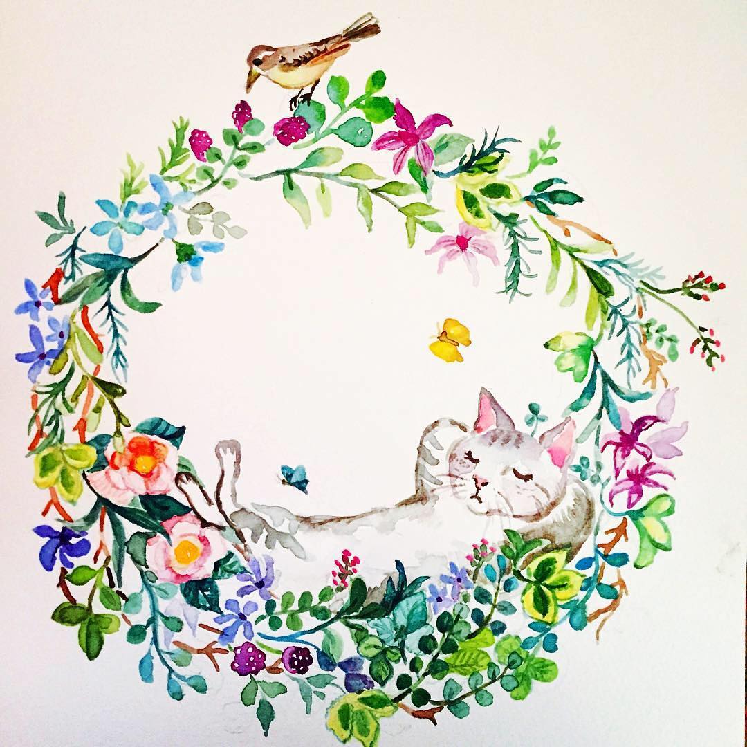 高校で美術を教えながら自身の作品をInstagramでシェアしている川越留美 (@rumiplus) さんは、幼い頃から絵を描くことが好きで、高校でも大学でも美術を学んだ。「自分の中から出てくるオリジナリティーを大切にしています」山間部に生まれ育ち、学生時代は山岳部で山に親しむなど、自然からのインスピレーションを作品に込めることが多かった。「里山の自然を通して、動物、植物、人間など森羅万象における共存、共生、平等をテーマに描いています。観た方がそれぞれのイマジネーションで、個々のものがたりの世界を展開していけるような絵を描いていきたいです」10年前に捨て猫を家に入れたことから猫が絵に登場するようになり、それから他の動物たちも作品に描くようになった。「一人一人の思いが違うように、一つの絵から感じ取るものは違うと思いますが、絵を通して、何か優しく温かいものがひろがっていければと思っています。それは一つの祈りのようなものです」