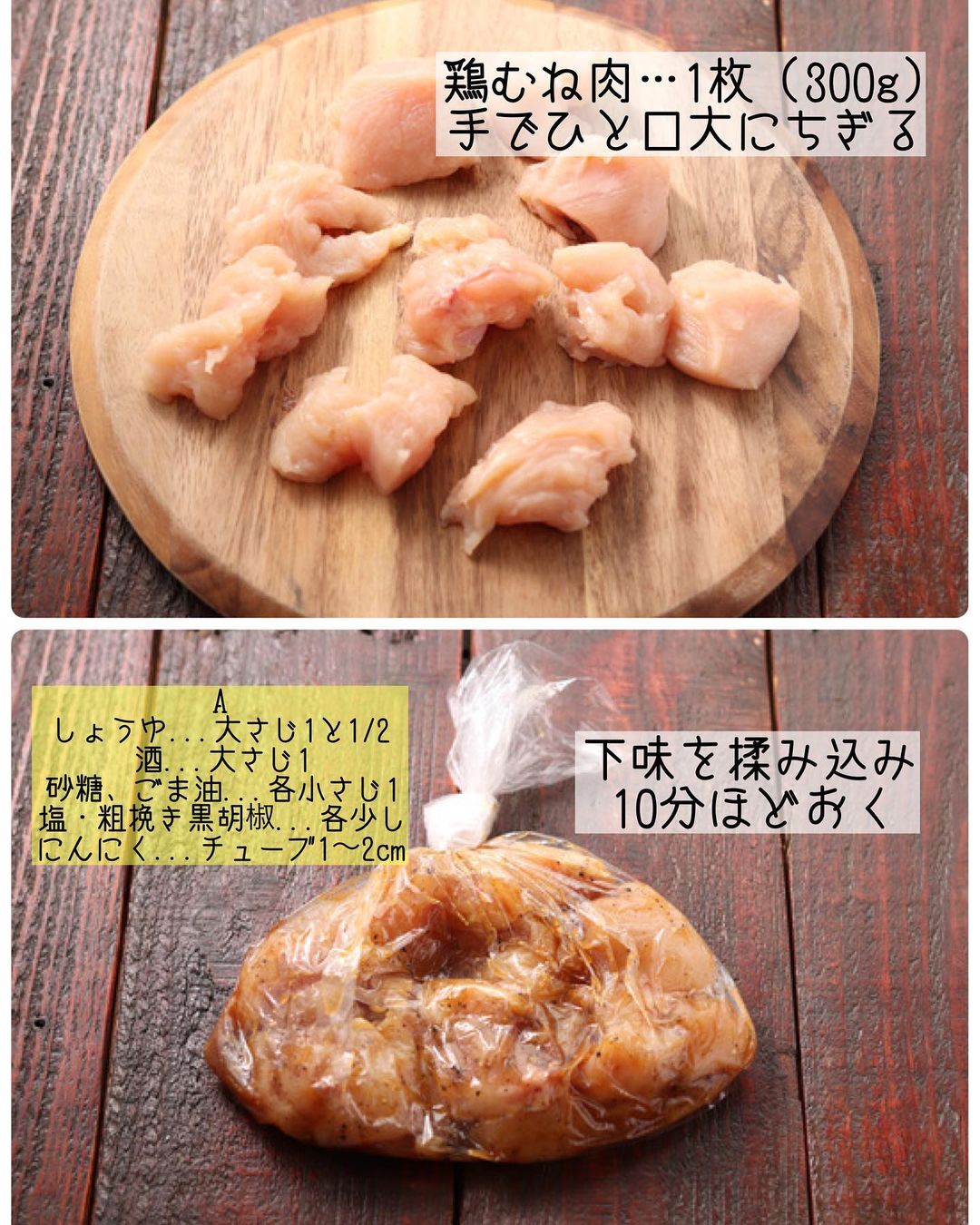 ➊鶏肉は皮をとってフォークで数カ所穴をあける。縦半分に切り、手でひと口大にちぎる(2cm幅のそぎ切りにしてもOK!)。【A】と共にポリ袋に入れてよく揉み込み、空気を抜いて口を閉じ、10分ほどおく。