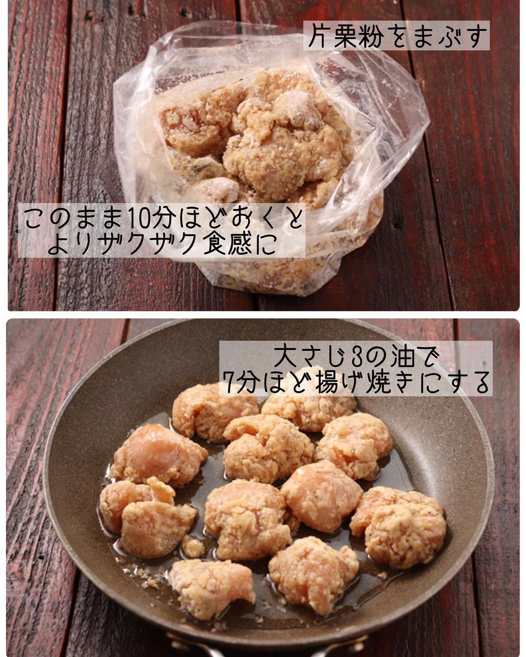 ➋1のポリ袋に片栗粉大さじ3を加え、粉っぽさがなくなるまでよく揉み込む。残りの片栗粉大さじ3を加え、口を閉じて上下にふり、まんべんなくまぶす。(時間があれば、このまま口を開けたまま10分ほどおくと、よりザクザク食感に!)