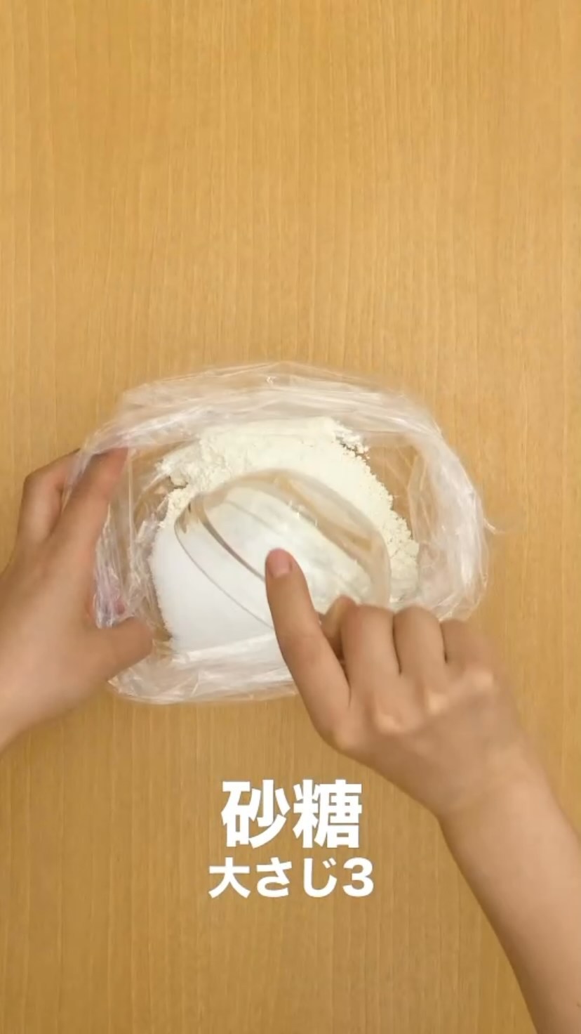 (1)ビニール袋に薄力粉、砂糖を入れて振って混ぜる。卵黄、溶かしバターを加えて揉む。(卵黄はM玉(17g程)を使用しています。