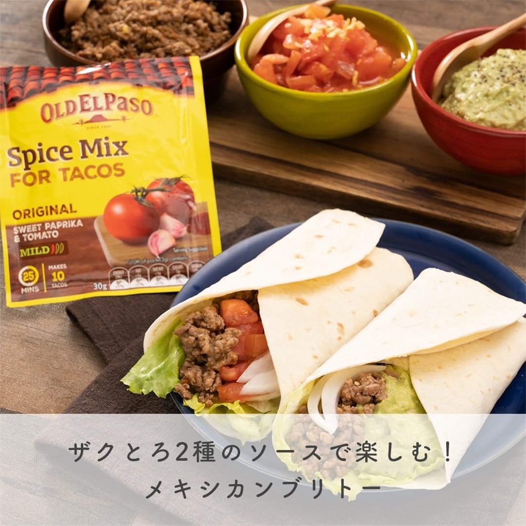 ザクとろ2種のソースで楽しむ メキシカンブリトーのご紹介です。ガーリックチップのザクザク食感がやみつきになるトマトソースは、トマトの酸味とガーリックの風味が相性抜群です。とろとろ食感がおいしいアボカドソースは、マヨネーズのコクで濃厚な味わいに仕上がります。「オールドエルパソ タコシーズニング」を使えば、難しいイメージのタコミートも簡単に本格的な味わいに仕上がります。スパイシーで旨みたっぷりのタコミートは2種のソースとよく合い、野菜もたっぷりおいしく食べられます。ぜひ、おうちでメキシカンパーティーをお試しくださいね!