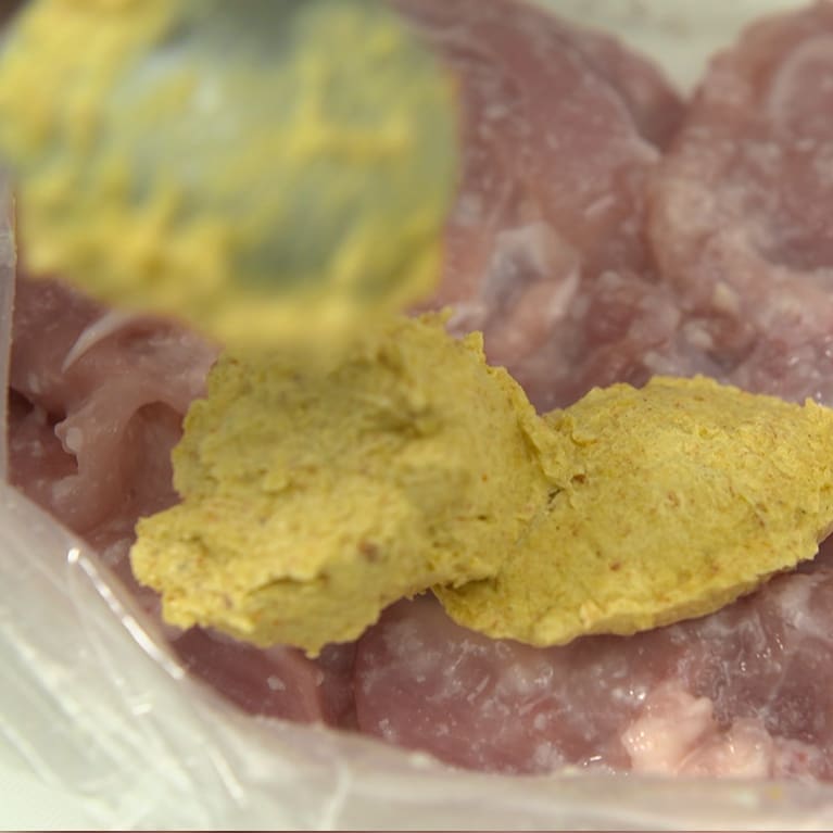 ④フライパンに油を引かず、揉みこんだ鶏肉の皮目を下にして置き保存袋に残ったペーストを再度肉に塗る