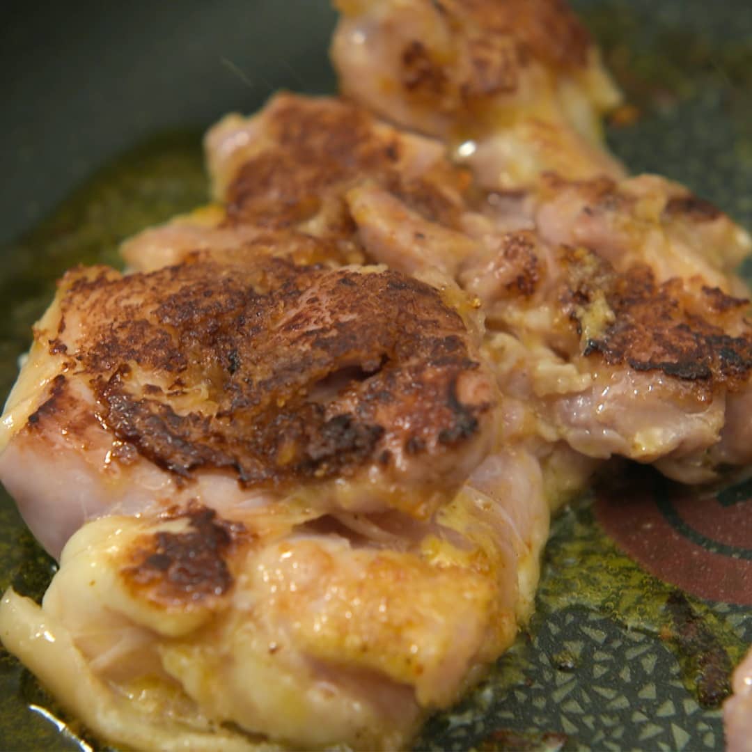 ⑤中火で鶏肉に焼き目がついたらひっくり返し弱火で片面5〜7分ずつ焼く