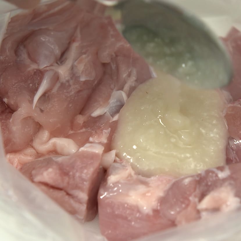 ②鶏肉に保存袋に入れ塩麹大さじ1を揉みこむ
