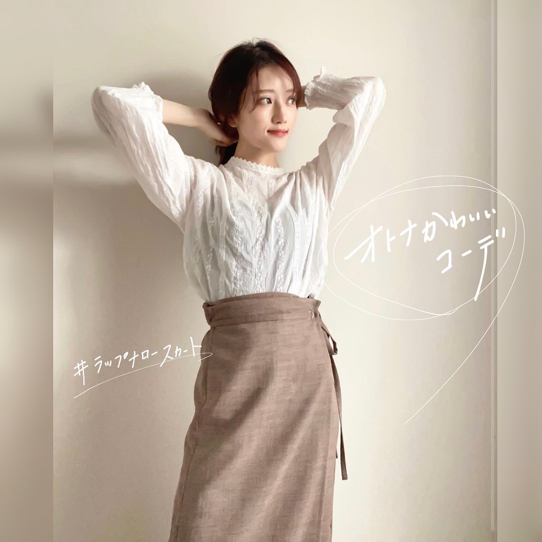 ラップ風のデザインが、コーデの主役になるスカート✨フェミニンな、レースのブラウスとの相性がバッチリですね👍ナチュラルな雰囲気も感じる👌品の良い、レディな美スタイルです🥰ウエストマークがポイントなので、トップスをINして着るのがオススメ🙌是非、チェックしてみてくださいね💁♀️💕