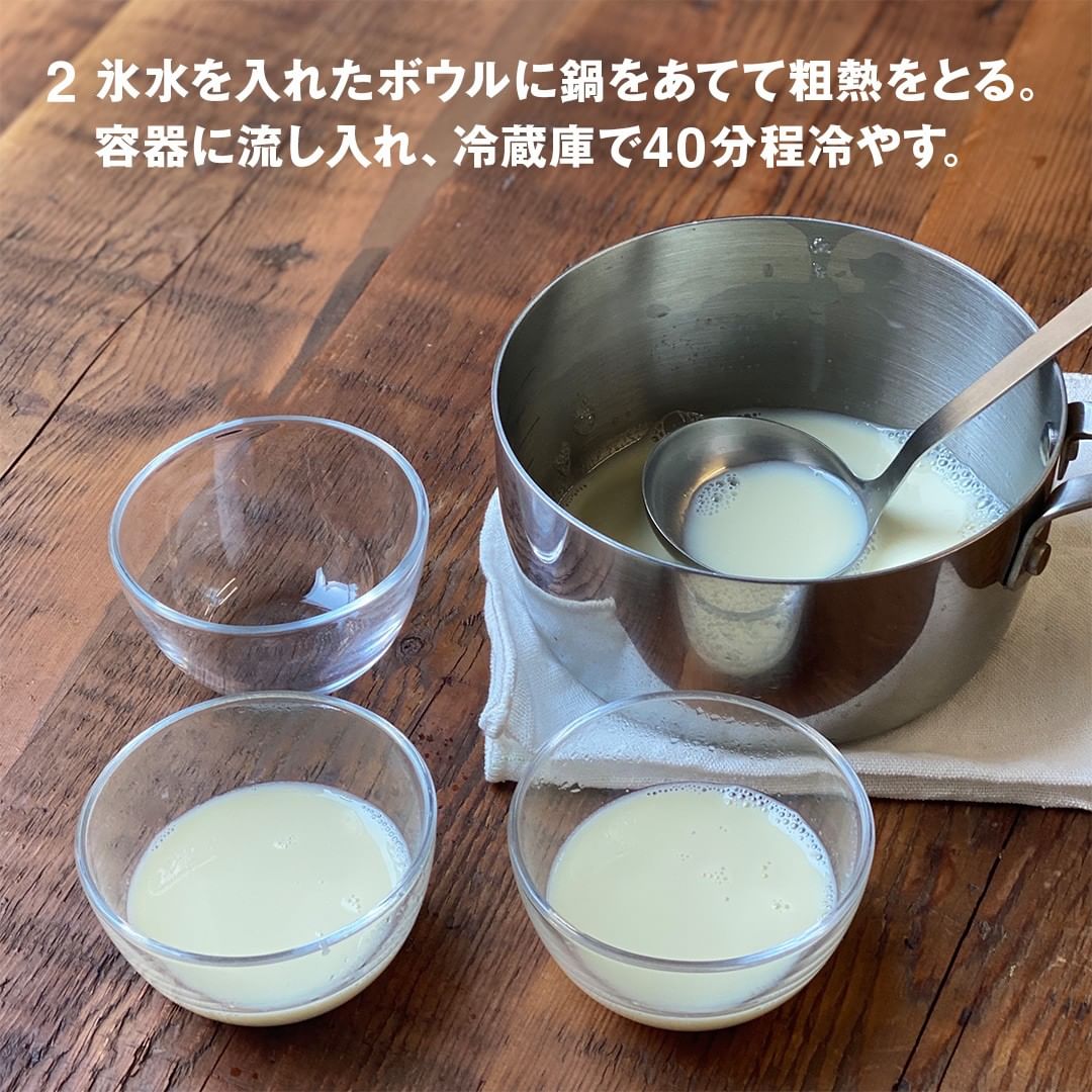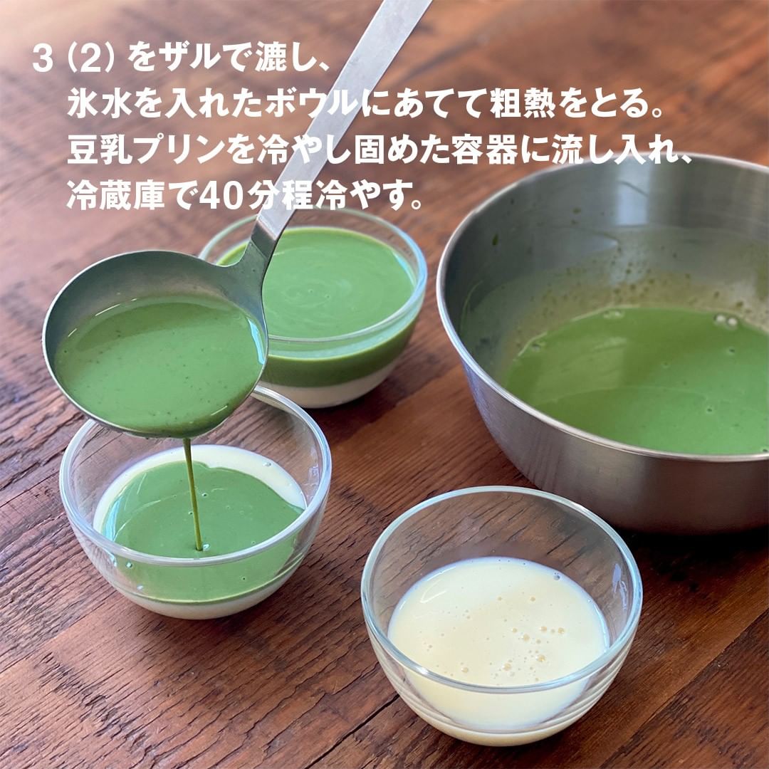 3.(2)をザルで漉し、氷水を入れたボウルにあてて粗熱をとる。豆乳プリンを冷やし固めた容器に流し入れ、冷蔵庫で40分程冷やす。