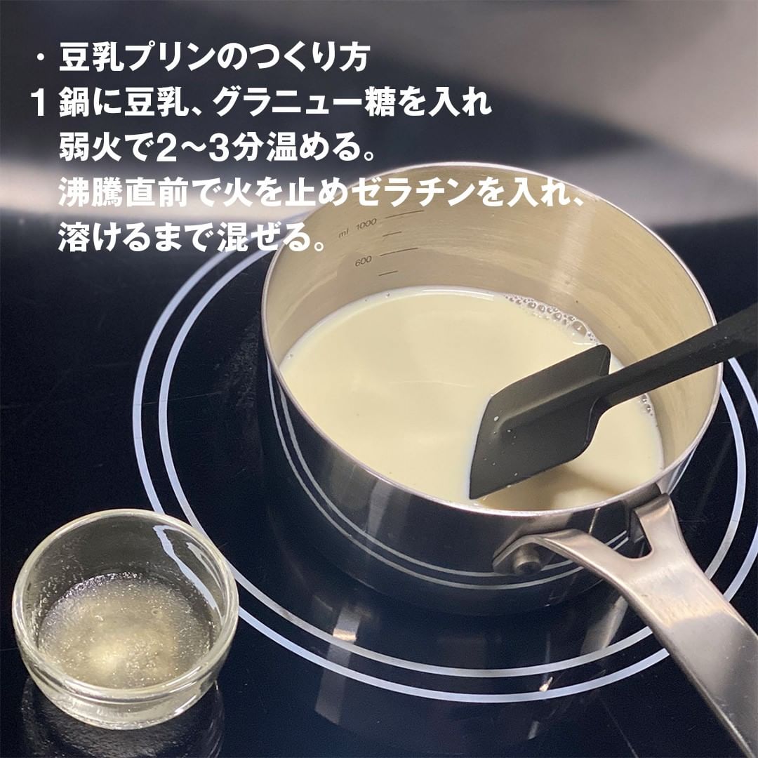 1.鍋に豆乳、グラニュー糖を入れ弱火で2〜3分温める。沸騰直前で火を止めゼラチンを入れ、溶けるまで混ぜる。