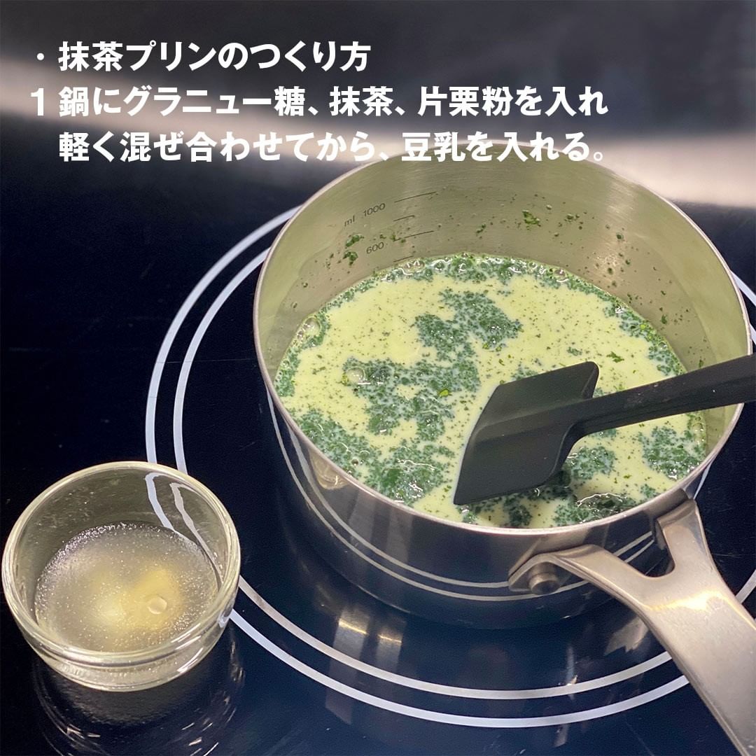 1.鍋にグラニュー糖、抹茶、片栗粉を入れ軽く混ぜ合わせてから、豆乳を入れる。