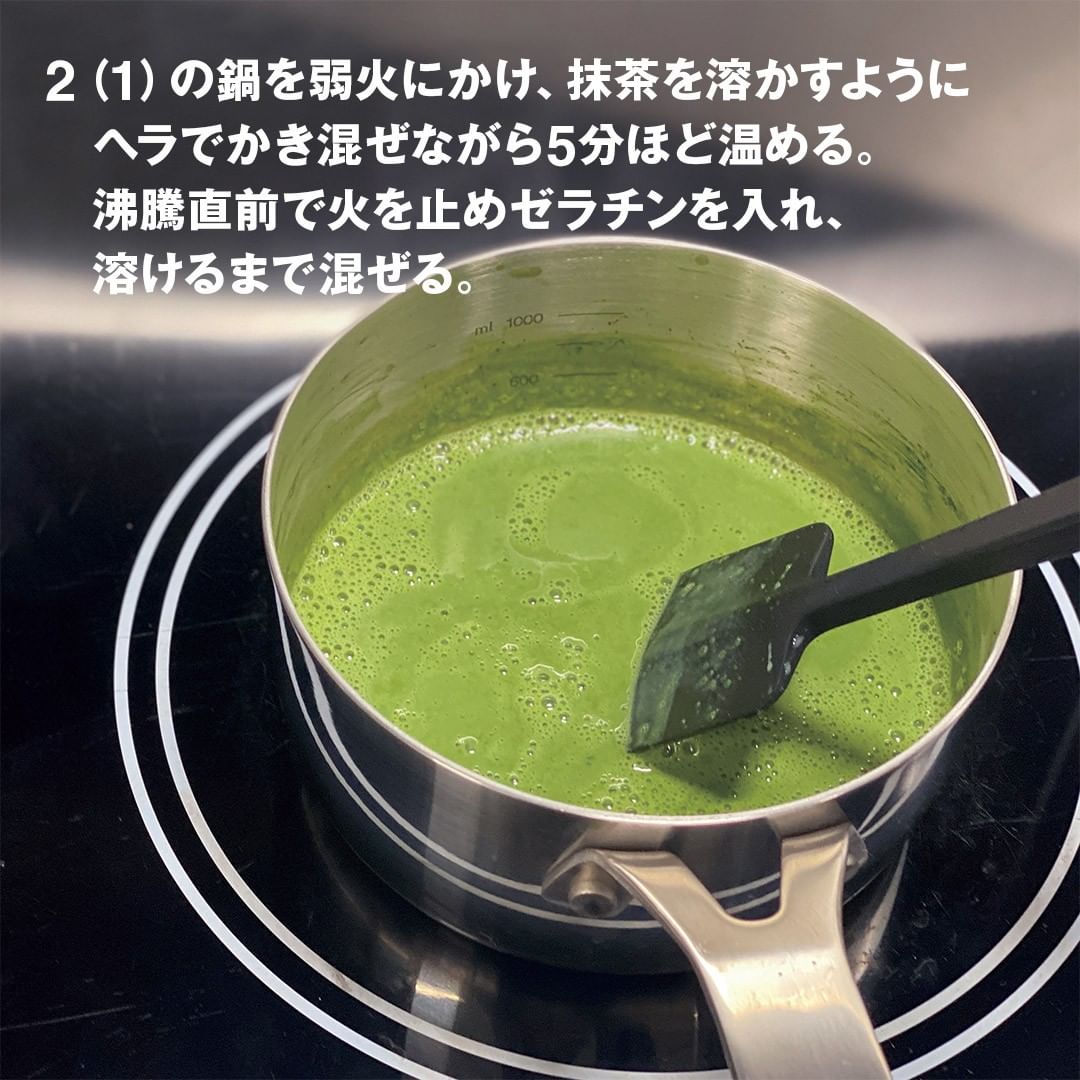 2.(1)の鍋を弱火にかけ、抹茶を溶かすようにヘラでかき混ぜながら5分ほど温める。沸騰直前で火を止めゼラチンを入れ、溶けるまで混ぜる。