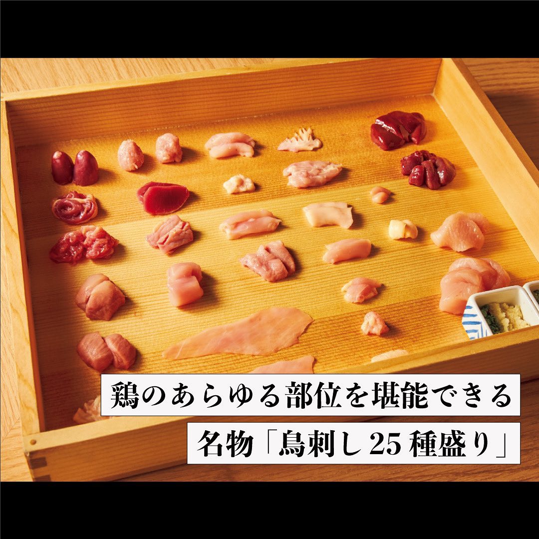 皮の脂で備長炭の香りを引き出し、纏わせた「ももねぎ」 や、井上さんイチオシの鶏のあらゆる部位を堪能できる「鶏刺し25種盛り」を味わえるなど、未体験の焼き鳥ディナーに高揚しっぱなし! 一度訪れたら誰かに話したくなり、連れて行きたくなる。