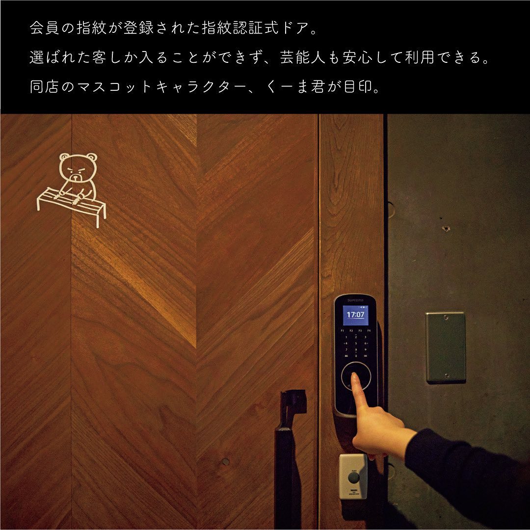 中目黒駅から少し離れた路地にあるビルの2階のお店。看板に店名はなく、熊の可愛いイラストが目印だ。店は会員制で、入口のオートロックは指紋認証で解除。限られた人しか利用できない安心感と、特別感に心がくすぐられる。