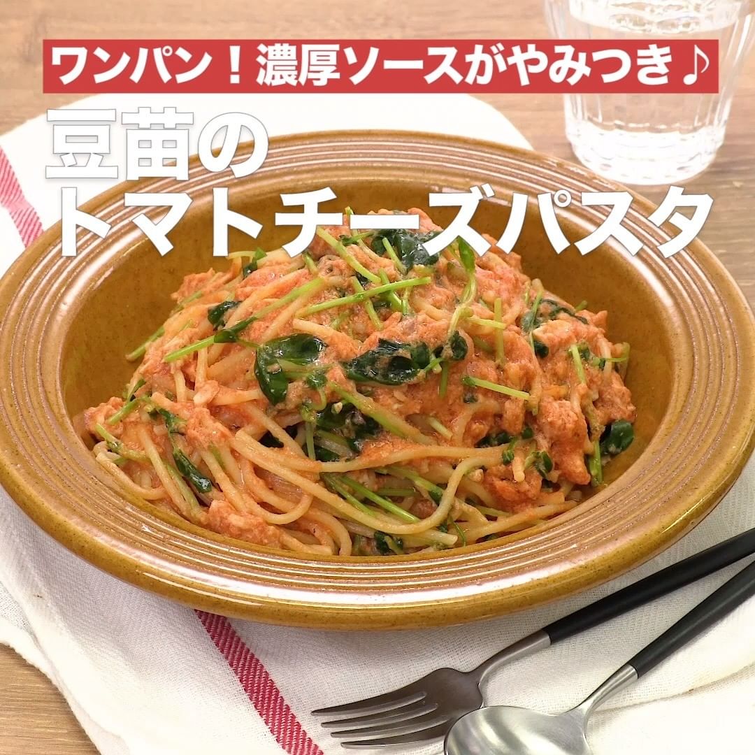 ⑤<ワンパン!濃厚ソースがやみつき♪豆苗のトマトチーズパスタ>