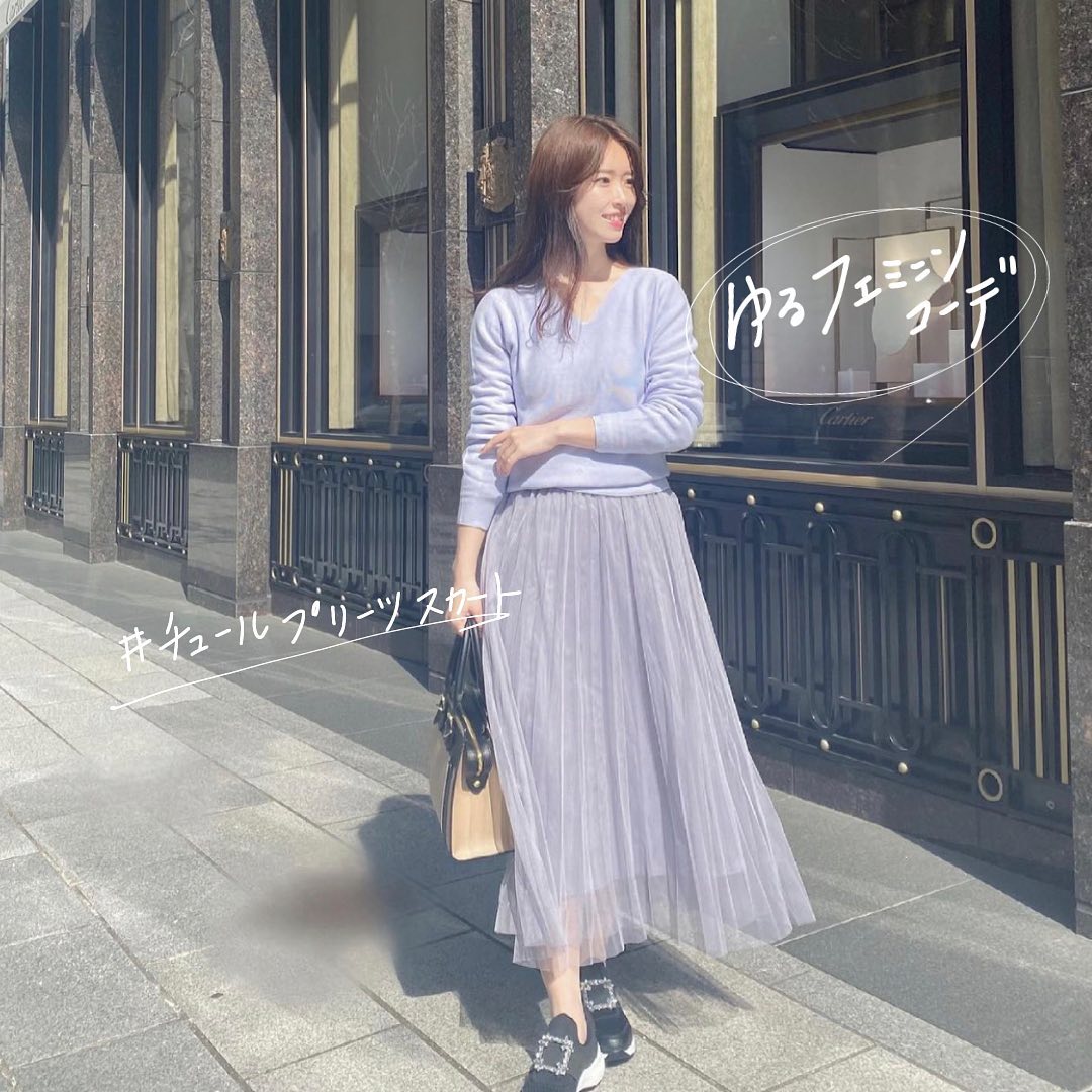 軽やかなチュール素材のプリーツスカート✨ニットと合わせた、品のあるレディコーデがとてもお似合い😘ふわりと風になびくプリーツが、女性らしさを引き立たせてくれます👌